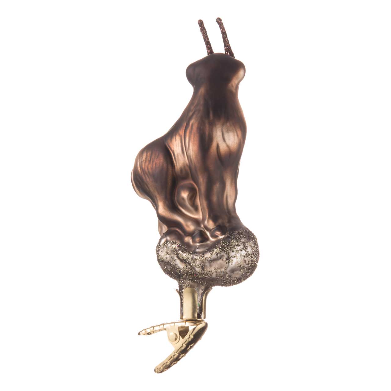 In einem elegantem Braunton schimmert das Fell; die Hufen sind gekonnt auf einem silbernen Felsbrocken platziert. Dieser wurde jedoch je nach Variante unterschiedlich verziert: wahlweise mit einem (aufgeklebten) Kunststoff-Edelweiß oder aber mit rustikalem, braunen Glitterstaub. Der Clou: Das talentierte Klettertier wird nicht gehängt, sondern geklippt. Auf diese Weise wird es zum wahren Kraxelkünstler in Ihrem Weihnachtsbaum.