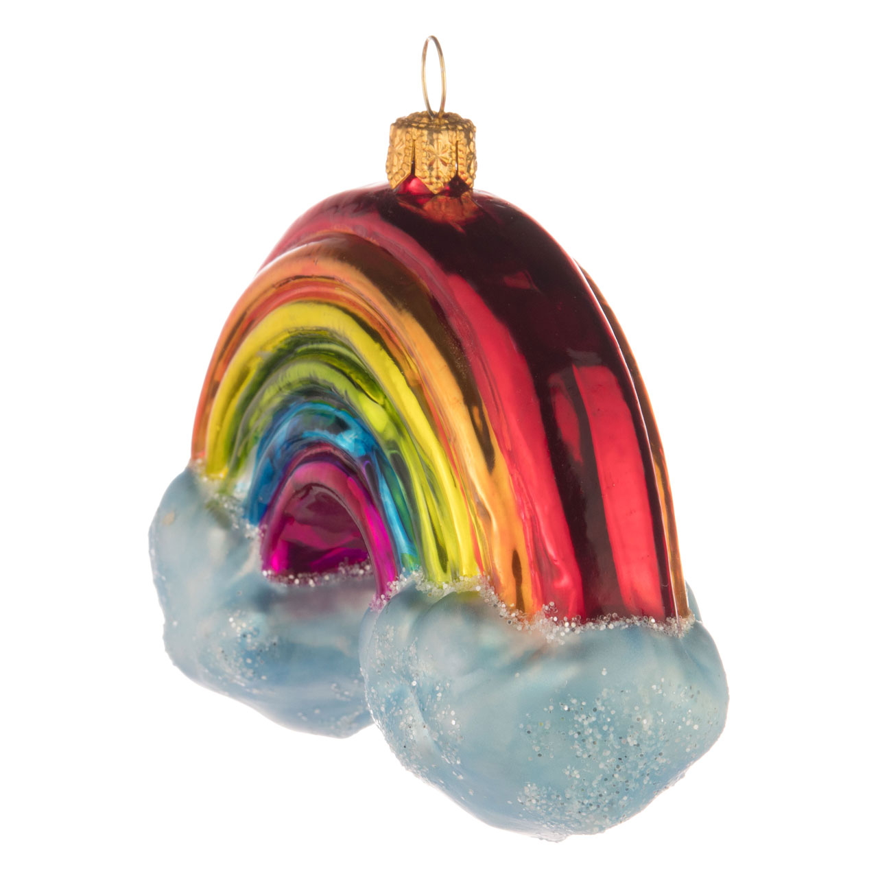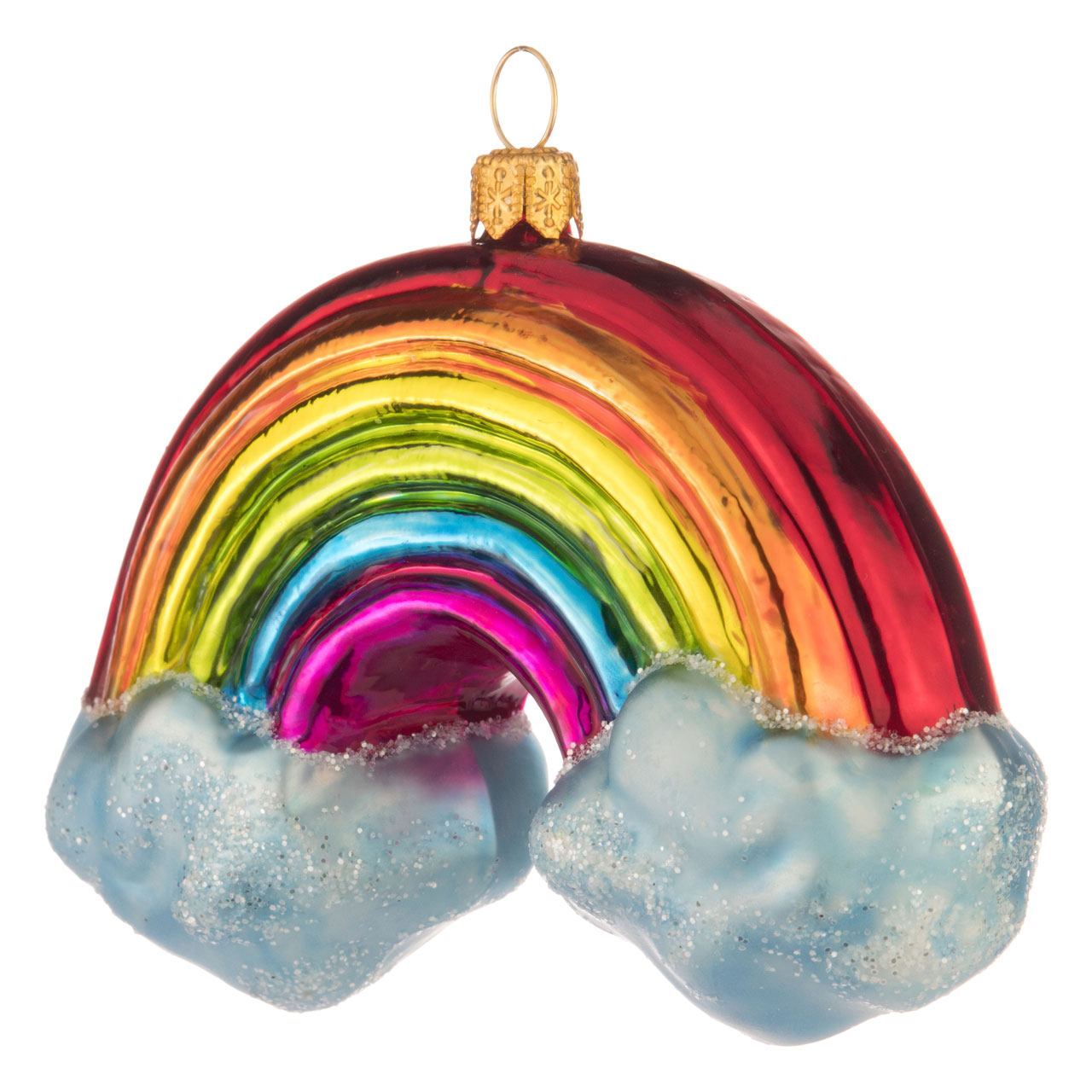 Herrlich bunt und dennoch gemeinsam und stimmig - so wölbt sich auch dieser Regenbogen für den Tannenbaum in glänzenden Farben: Auf zwei bauschigen, himmelblauen, leicht beglitzerten Wolken erhebt er sich pink im Kern über blau, grün, gelb, orange bis zu einem leuchtenden Rot an der Außenseite. Herrlich glänzend. Herrlich Prägnant. Und irgendwie gute Laune stiftend.
