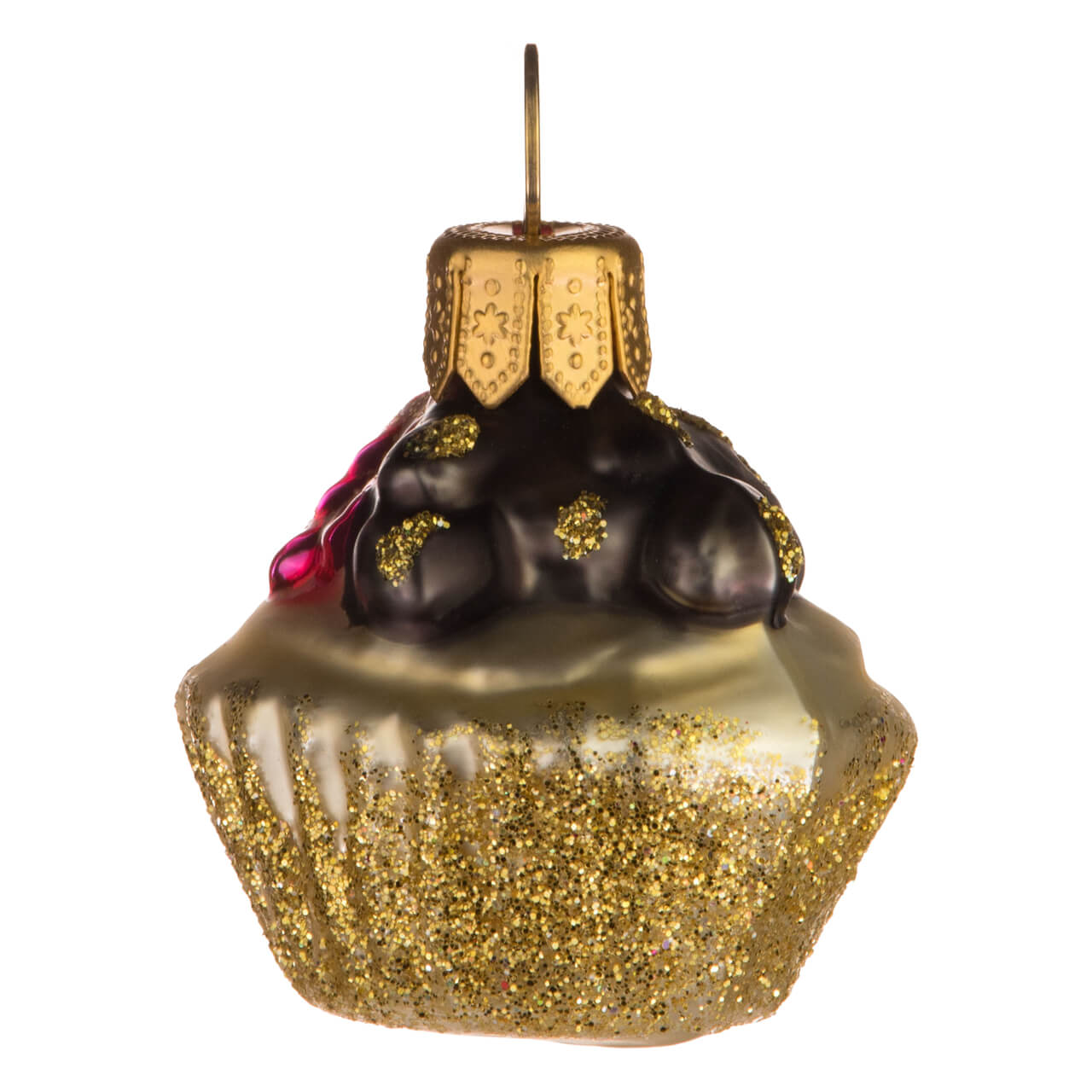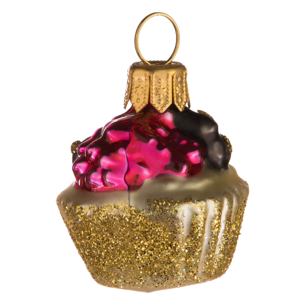 Golden beglittert schimmert die typische, gezackte Törtchenform. Champagnerfarben schimmert die matte Glasur. Rosa und anthrazit-grau glänzen gleich zweierlei Beeren obenauf, von denen die Blaubeeren zusätzlich mit goldenem Glitzer betupft wurden.