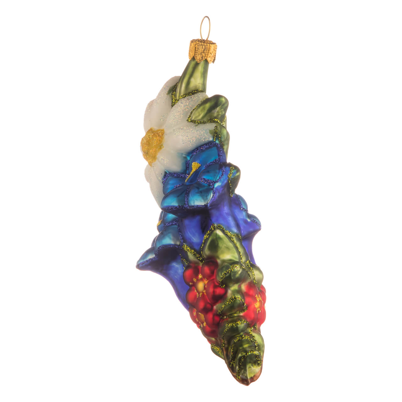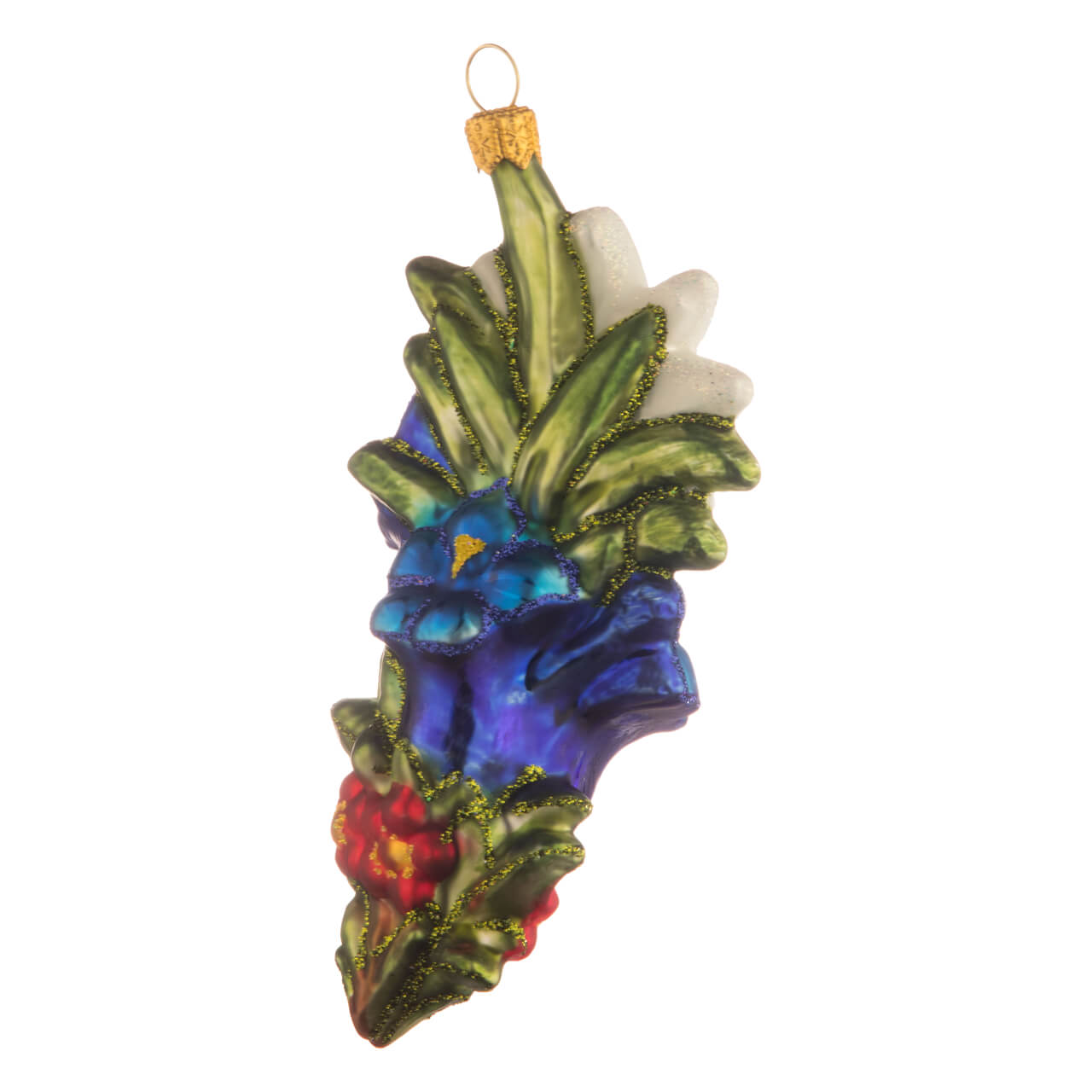 Das schönste Blümlein auf der Welt - ist gemäß eines berühmten Volkslieds ja das Edelweiß. Nicht minder schön ist jedoch der Enzian, vor allem in seiner stengellosen, großblütigen Version des Gentiana acaulis! Zusammen drapiert mit einer wunderschönen, rot-goldenen Blume und frischem Bergwiesengrün ergibt die Kombi ein herrliches Blumenbouquet, das als Glasfigur am Tannenbaum jede Menge Alpen-Sehnsüchte schürt.
