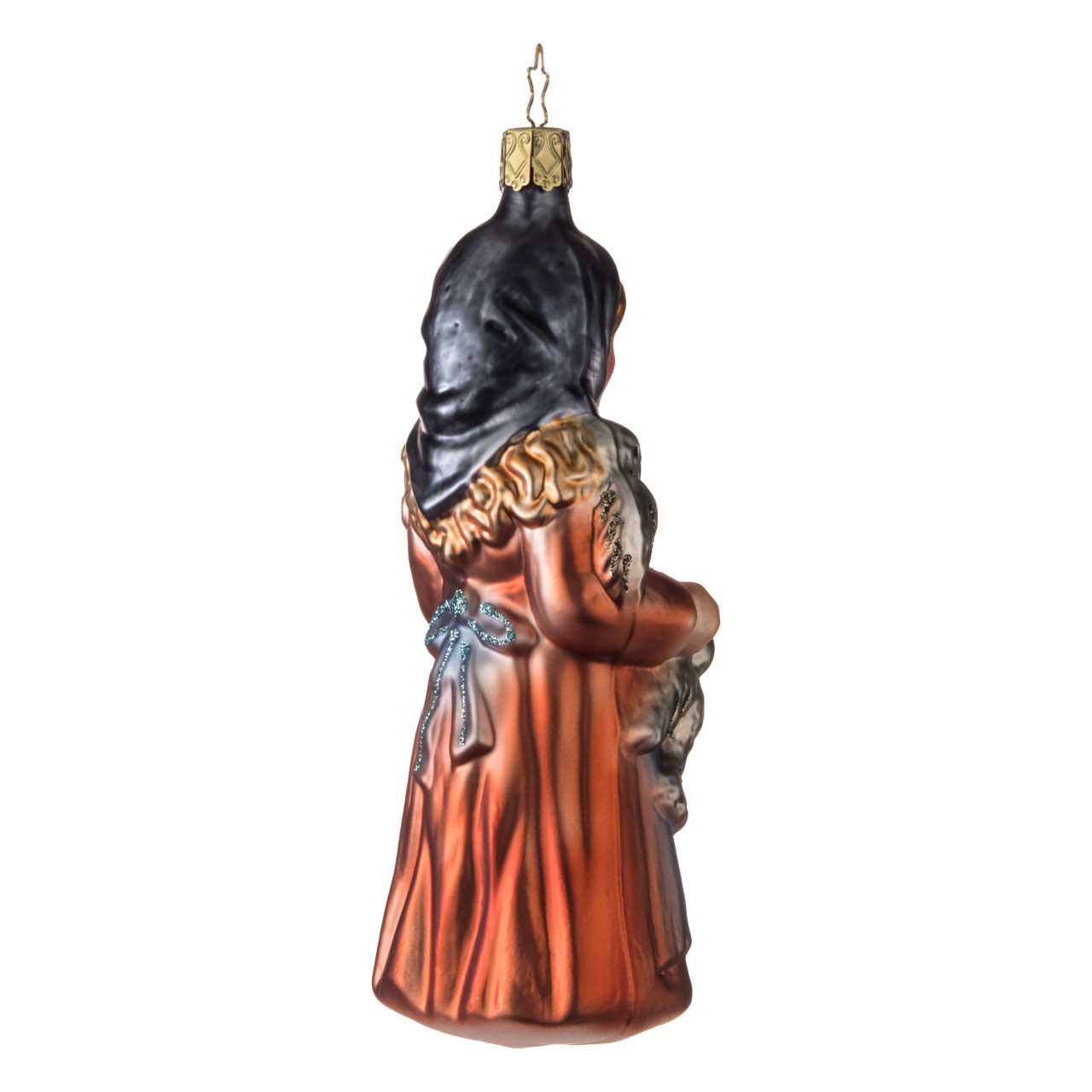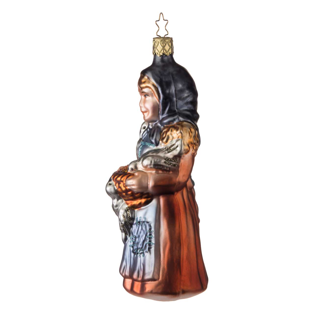 Diese Darstellung zeigt eine liebevoll gestaltete Figur in Form eines Mädchens mit Kopftuch und schimmerndem Kleid in sanften Grau-, Blau- und Kupfertönen. In ihren Händen hält sie eine Schale mit goldfarbenem Korn, umgeben von silbrig-glänzenden Vögeln – ein detailreiches Motiv voller Märchenzauber und Herzenswärme.