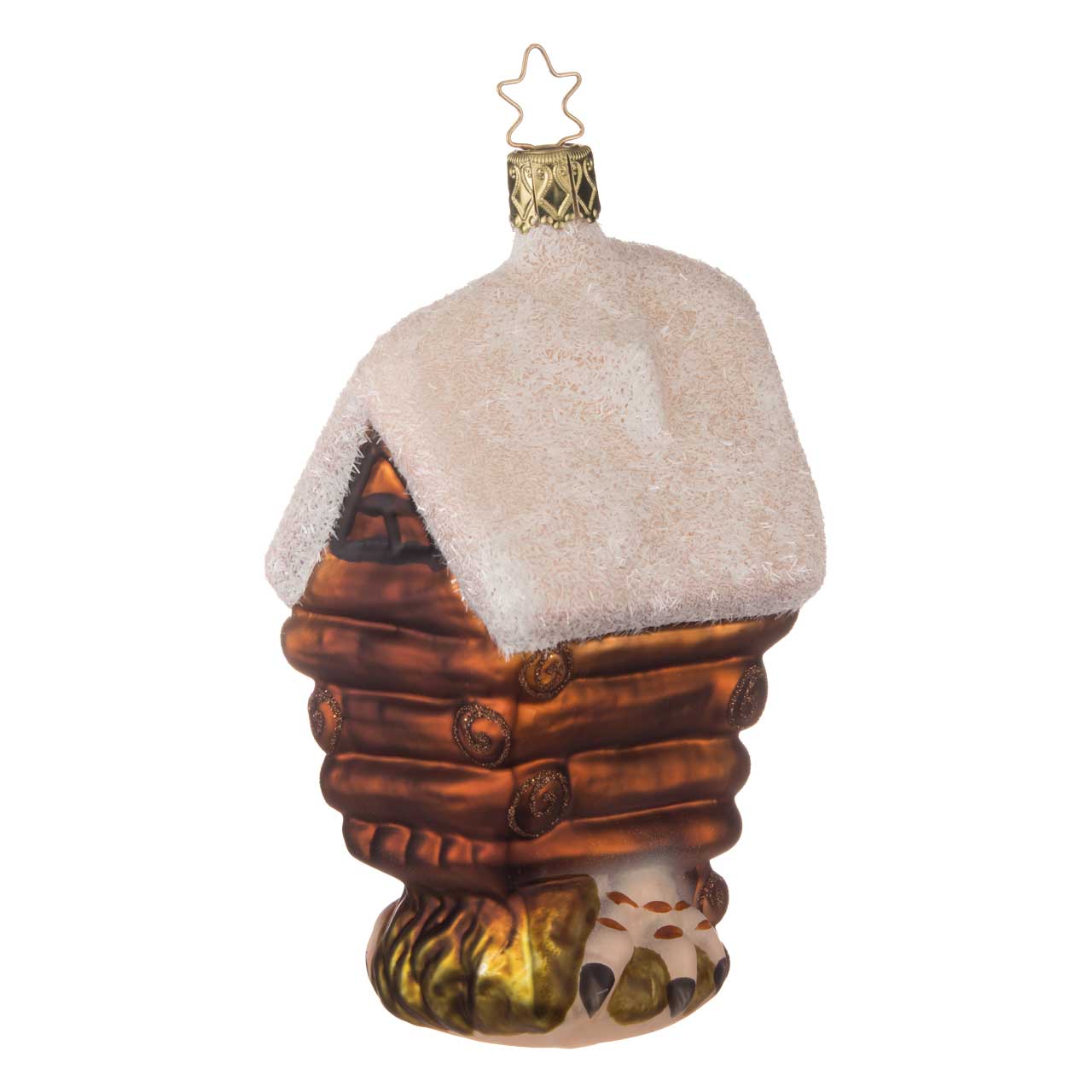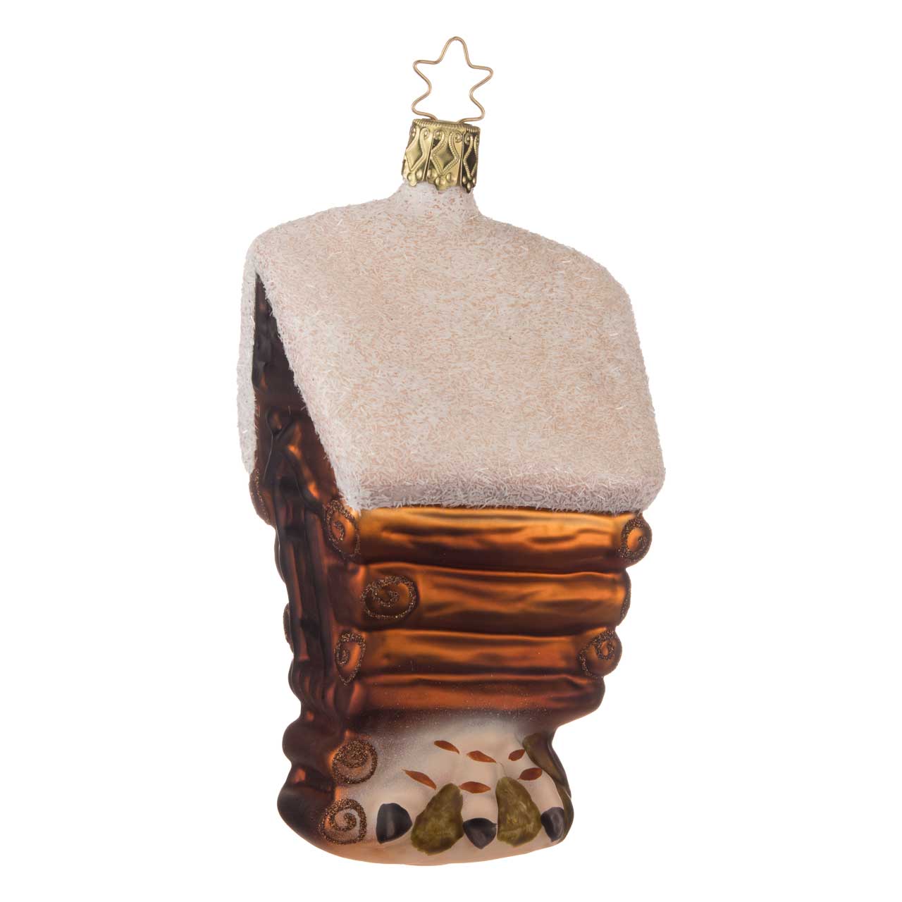 Die Figur zeigt eine rustikale Blockhütte mit einem markanten schneebedeckten Dach. Die Wände sind in warmen Holzbraun-Tönen gestaltet, während feine Akzente in Schwarz und Beige die Struktur der Baumstämme und den Eingang betonen. Das weiße, glitzernde Dach setzt einen hellen Kontrast und verleiht der Hütte einen winterlichen Charakter.