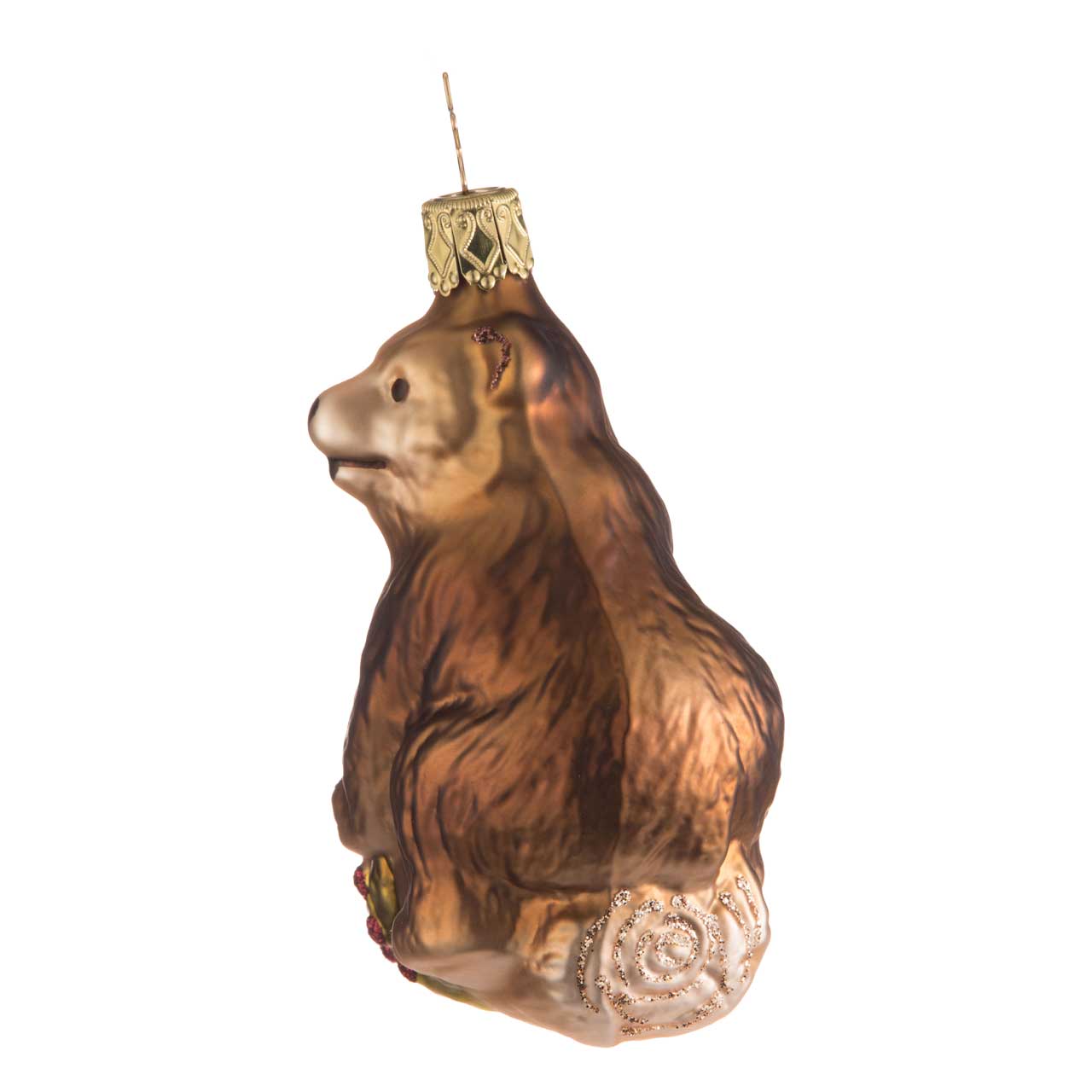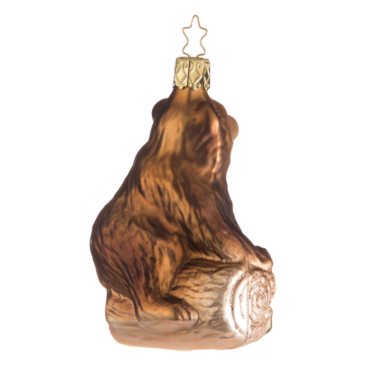 Süß sieht er aus mit seinem zotteligen, braunen Fell, den matt schwarzen, sorgsam aufgetupften Augen und der interessiert nach vorn gereckten Schnauze. Gemütlich wirkt die massige Gestalt. Mit Liebe wurde die Figur entworfen, was man nicht nur an den sanft drapierten Tatzen erkennt. Auch die Jahresringe des Stamms sowie ein paar rot glitzernde Beeren vor hellgrünem Blattwerk zeugen von einem leidenschaftlichen Blick für's Detail.