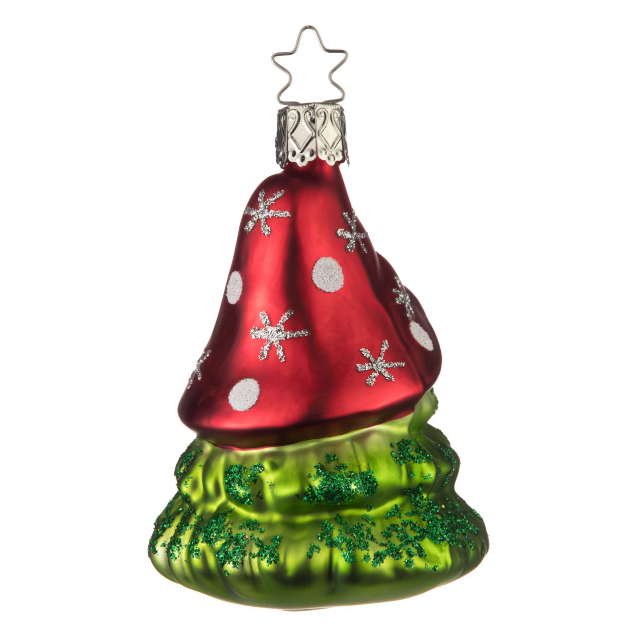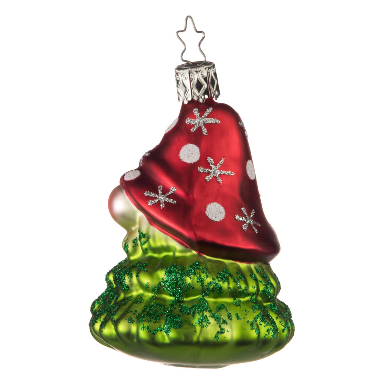 Weil das Wesen einfach nur komisch aussieht, lustig, absolut niedlich. Eindeutig ein Tannenbäumchen bildet den Fuß, die Basis des Ganzen, das wiederum als hellgrüner, dunkelgrün beglitzerter Rauschebart gesehen werden kann. Denn gleich darüber folgt die Nase: hautfarben, groß und rund. Als krönender Abschluss? Nein, als Zwischengeschoss, denn obenauf thront eine große, weihnachtsrote Zipfelmütze, die nicht nur mit weißen Punkten, sondern auch silbern glitzernden Sternen verziert wurde.