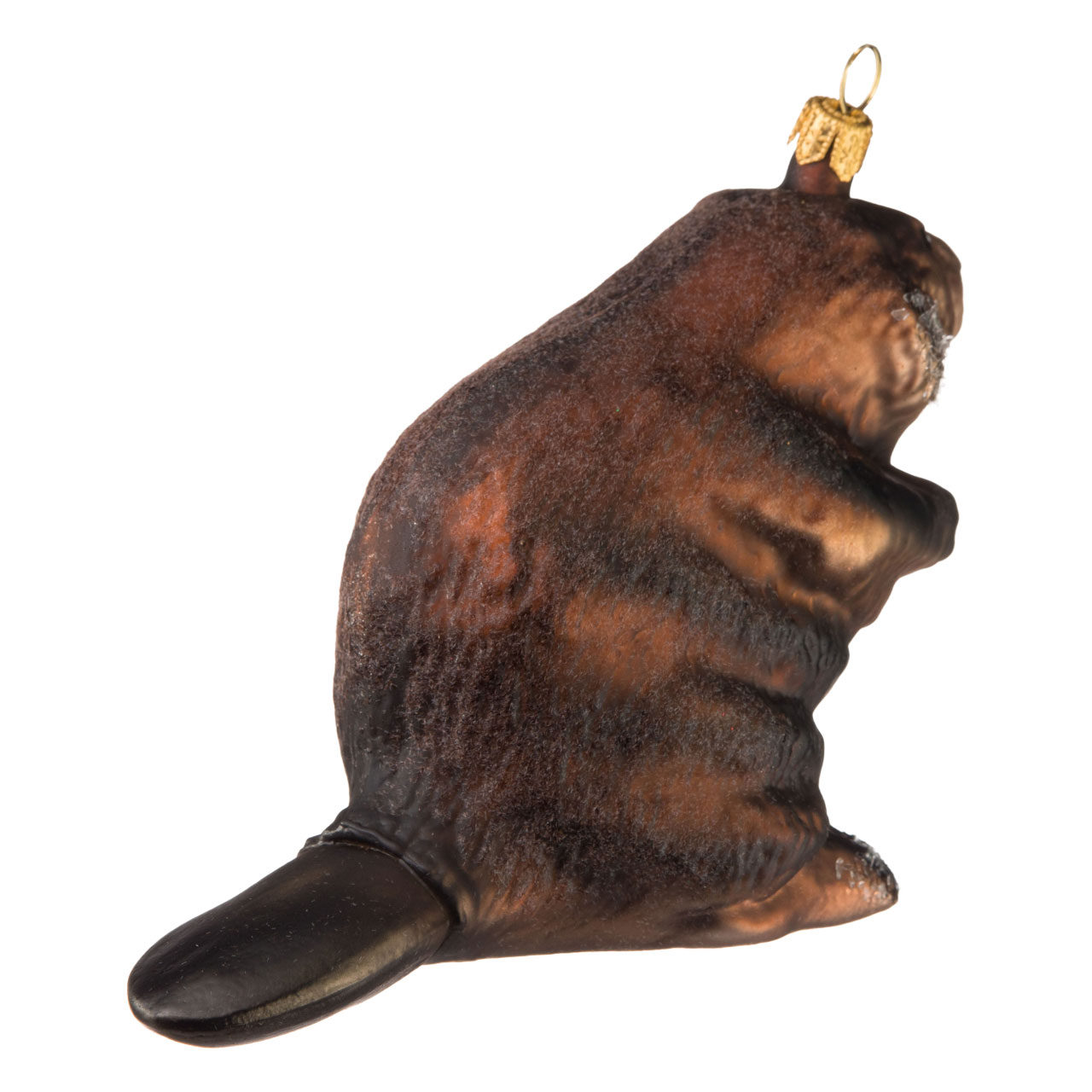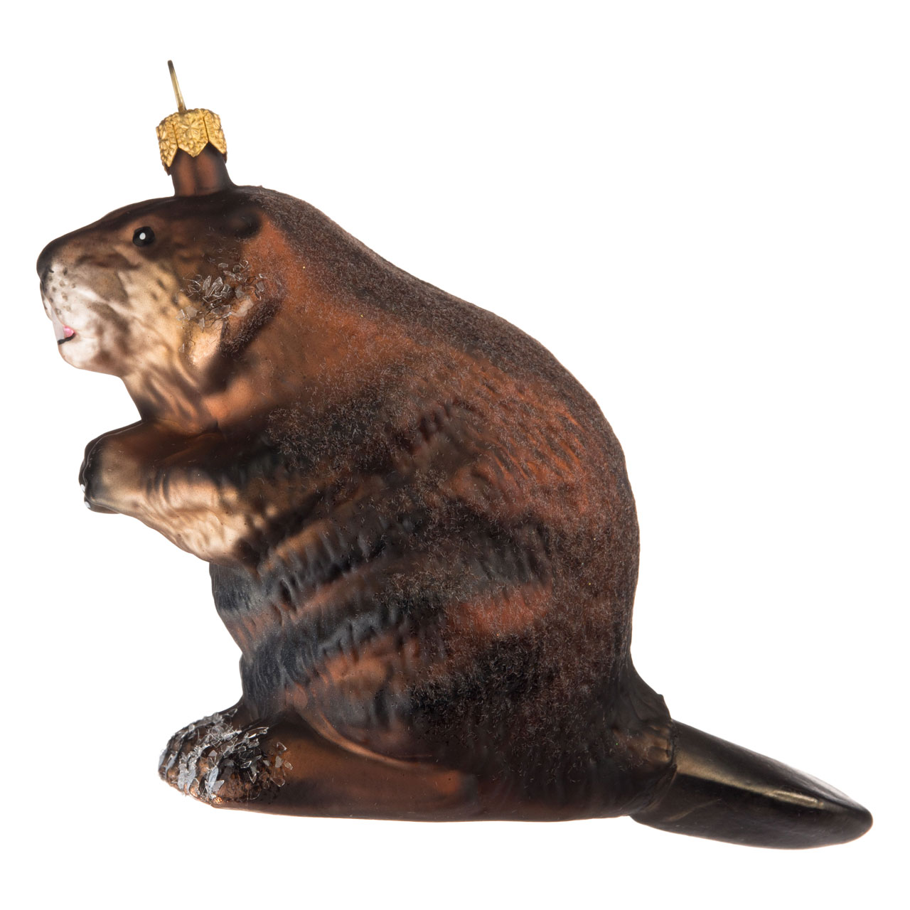 ... ganz wie dieses Exemplar für den Tannenbaum, das sein natürliches Vorbild in wunderbar naturalistischer Form wiedergibt. In unterschiedlichen Brauntönen wurde das dichte Fell mit kunstvoller Airbrush-Technik besprüht; die Schnauze nicht nur ein bisschen heller, sondern auch mit sicherem Pinselstrich sorgsam ausgearbeitet: Schwarze Pünktchen suggerieren die Tasthaare, mattweiß leuchten die charakteristischen Zähne, hinter denen in zartem Roséton die Zunge hervorlugt. Aufrecht hockt das Tier, am Rücken der breite Schwanz, die Vorderpfötchen süß vor der Brust verschränkt. Durchsichtige Glitzersplitter an Füßen und Wangen sorgen passend zum Weihnachtsfest für winterliches Flair.