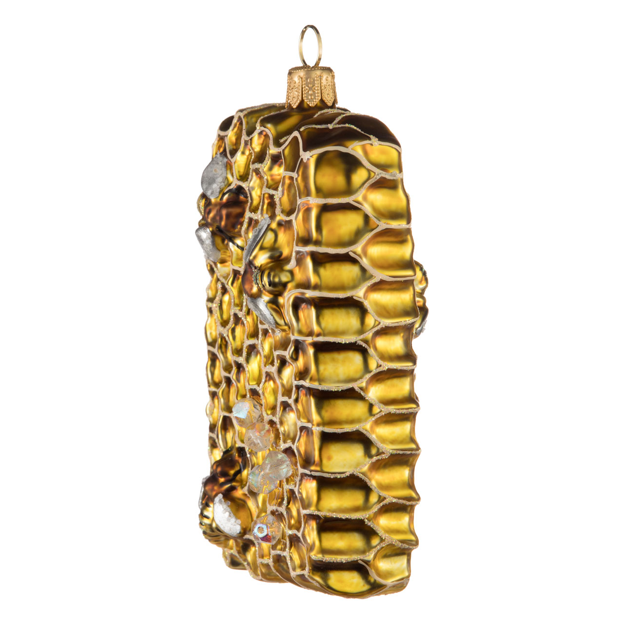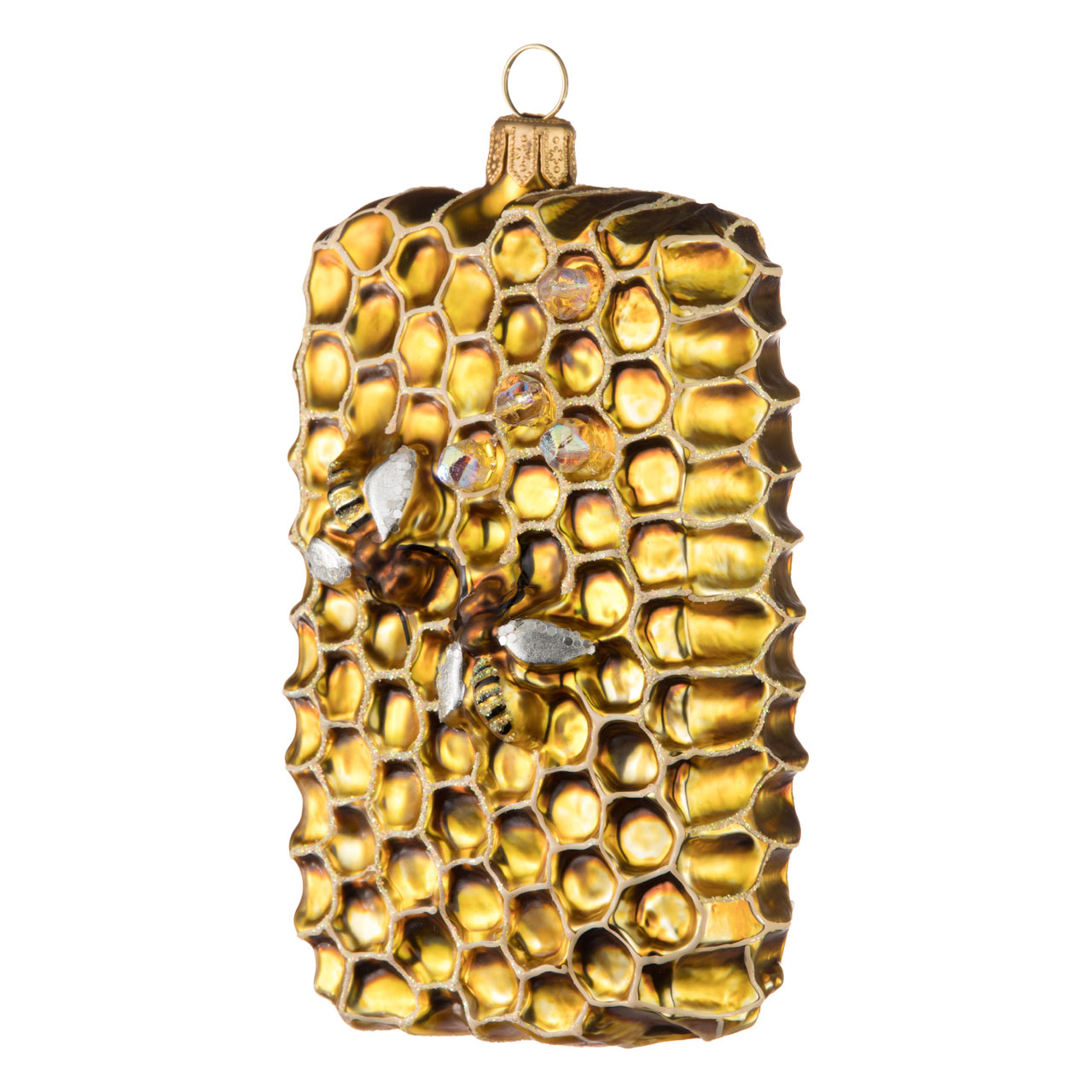 Kein Wunder. Das kleine Tierchen, das die goldene Süßigkeit produziert, beeindruckt nicht nur durch seine Fähigkeiten wie Kommunikation, Organisation und Tüchtigkeit. Es sieht auch äußerst dekorativ aus. An dieser Christbaumfigur findet man dazu alles vereint: Auf einem golden glänzenden, rechteckigen Wabenstück sitzen auf der Vorderseite gleich drei, auf der Rückseite zwei emsige Arbeiterinnen in typischer braun-gelber Färbung mit den charakteristischen Streifen auf dem Hinterleib sowie zart beglitterten, silbrigen Flügeln.