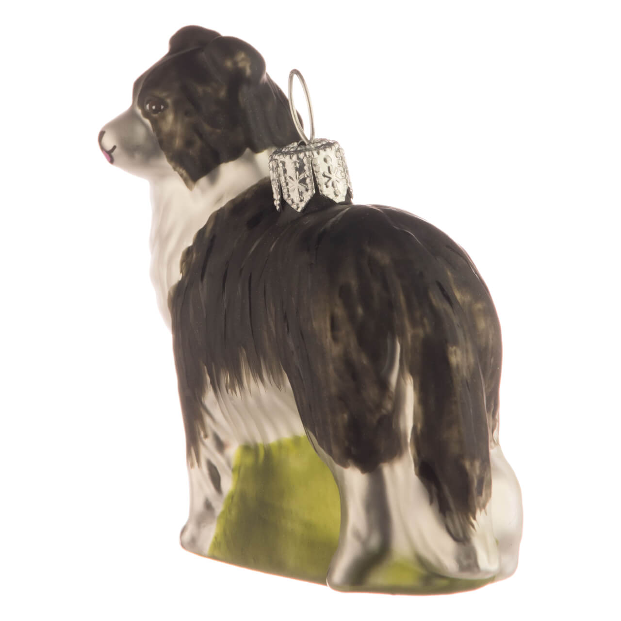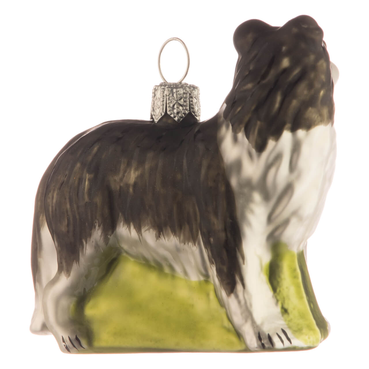 Ein langes, weiches Fell mit charakteristischer Zeichnung? Schwarz auf dem Rücken, die Unterseite wie auch die Beine Weiß und auf dem schwarzen Kopf eine schmale, weiße Blesse, die in eine weiße Schnauze mündet? Ganz klar, hier baumelt ein Border Collie vom silbernen Krönchen herab.
