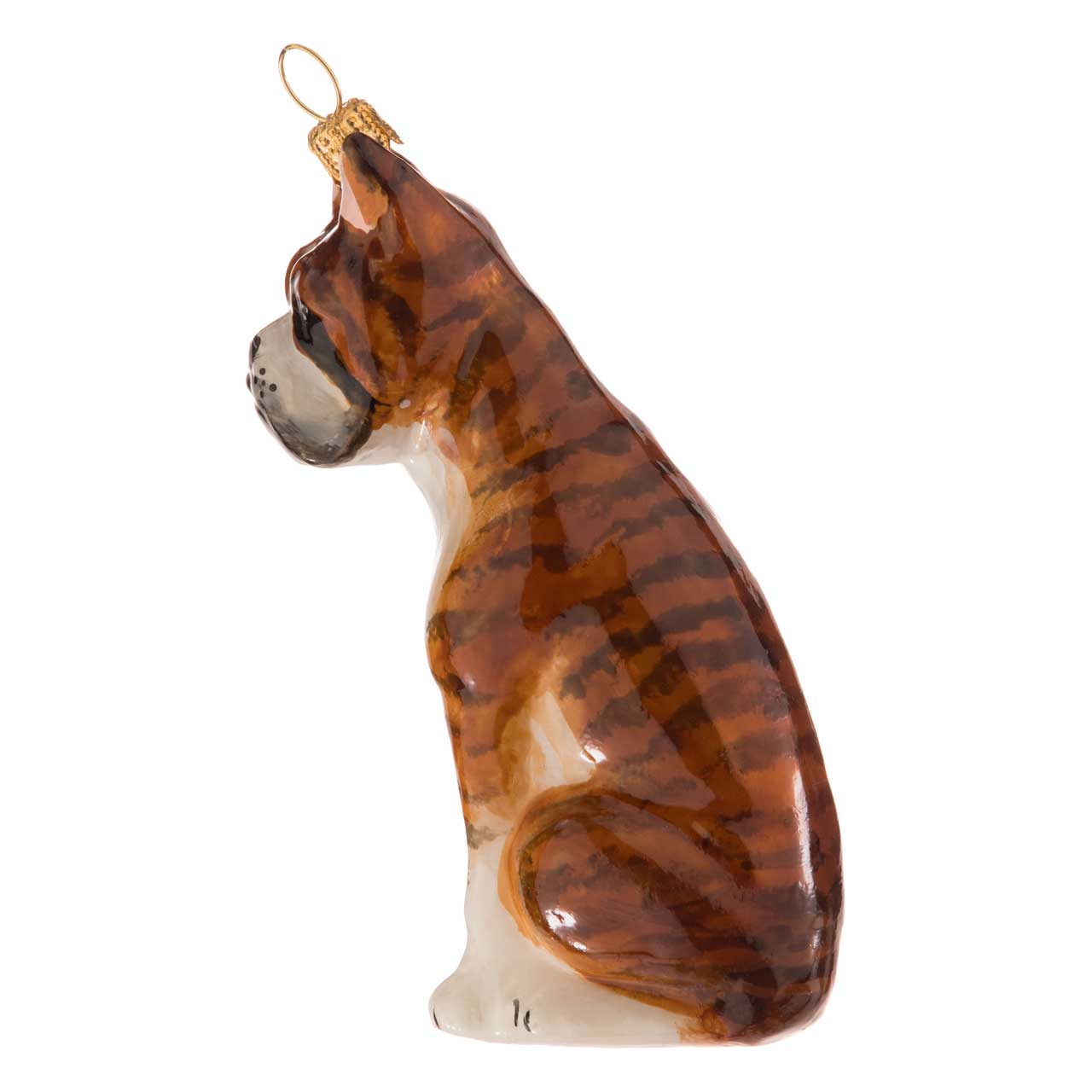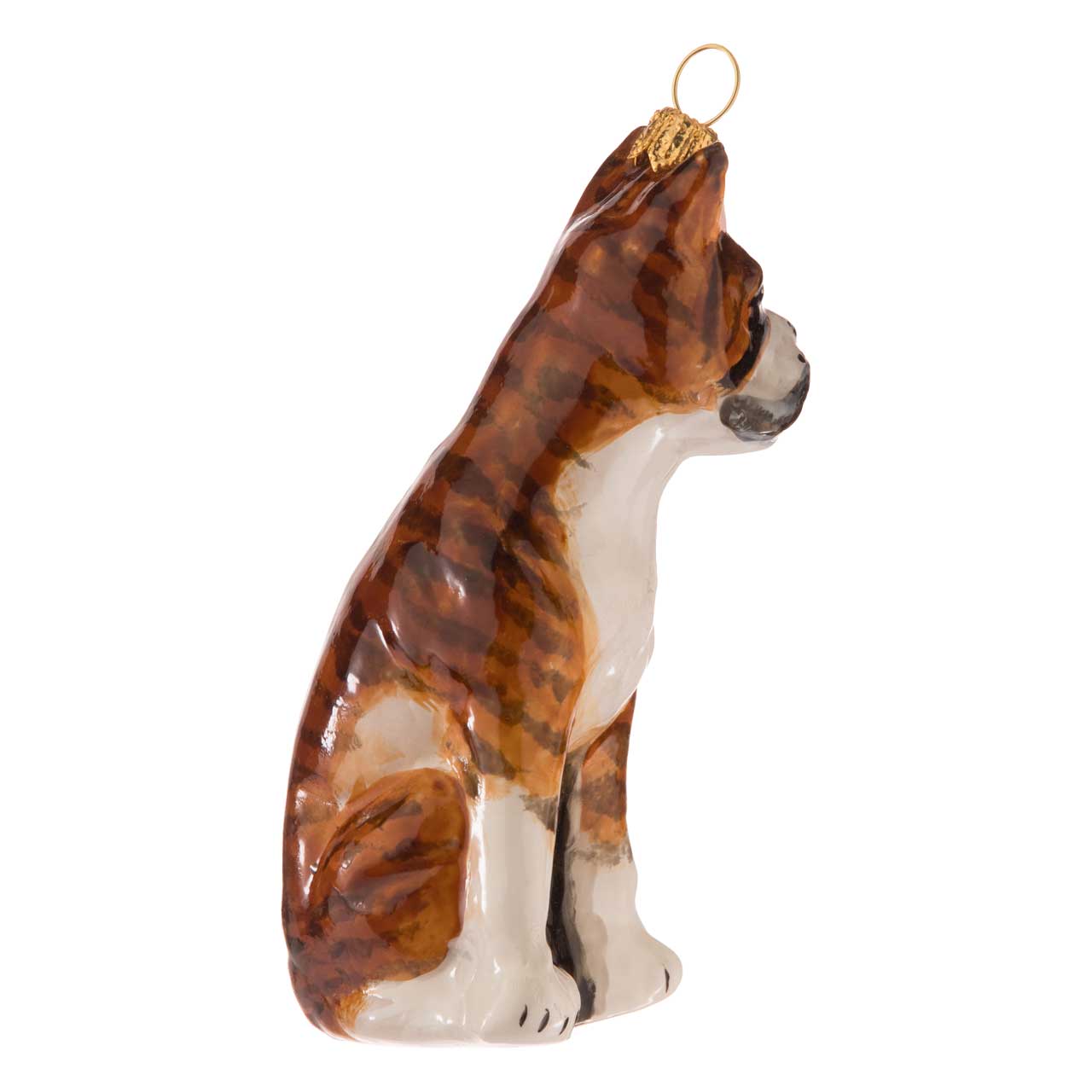 Wie ein Porzellanhund - so glänzt dieser Boxer für den Tannenbaum. Aufrecht sitzt er in typischer Sitzpose und baumelt vom goldenen Krönchen herab.
