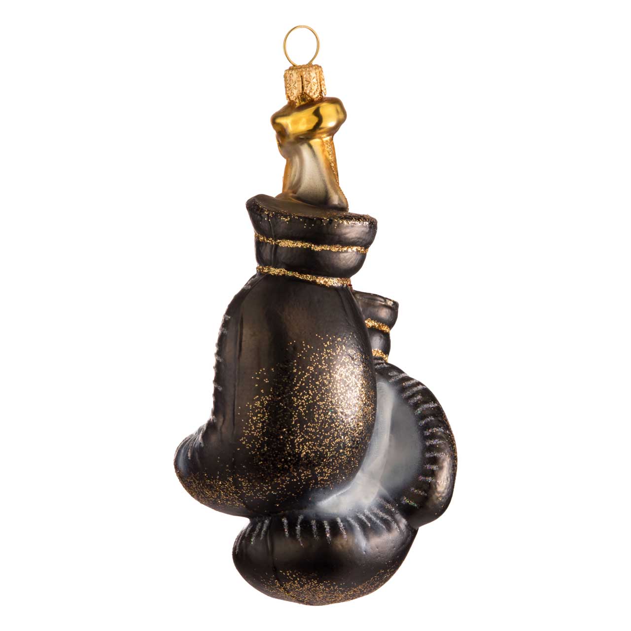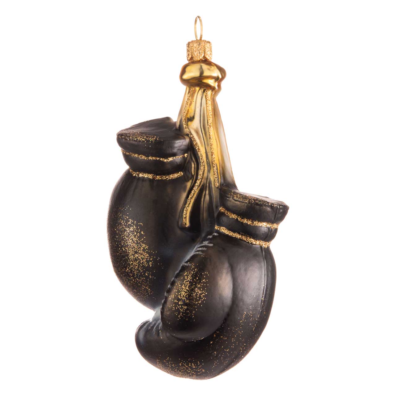 Edel, schön und dank des feinen Gitterstaubs an Manschetten und Schnürbändern regelrecht glamourös präsentiert sich hier nämlich ein Boxhandschuh-Paar als Weihnachtsdeko. Matt schwarz schimmern die Fäustlinge, wie aus echtem Leder genäht. Die Innenseiten leuchten dabei weißlich aufgehellt. Silberne Glitzerstreifen markieren feine Fältchen auf der Innenseite. Goldene Schnürbänder laufen in einem dicken Knoten unter dem goldenen Krönchen zusammen, von dem die beiden Handschuhe wie bei ihren großen Vorbildern in echt leicht versetzt hinunterbaumeln.