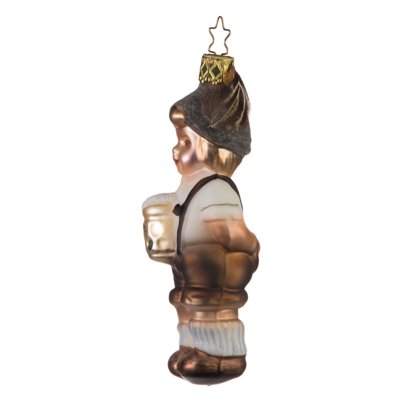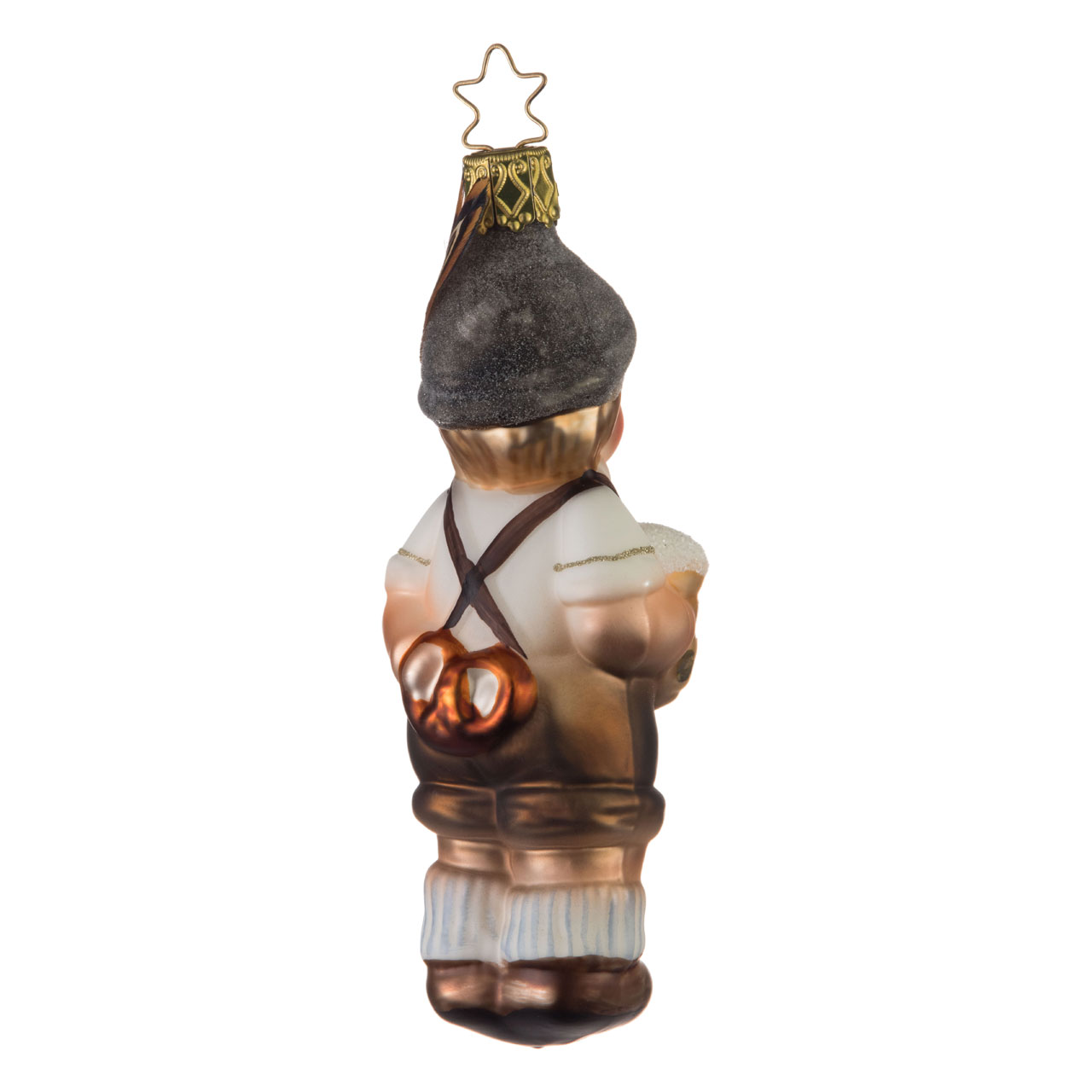Ein schneeweißes, kurzärmliges Hemd mit glitzernden Streifen an den Armen, weiße, dicke Strümpfe sowie eine lederbraune Knickerbocker lassen von Platzkonzerten und Bergpanorama träumen. Und der volle Bierkrug in der Hand? Der ist zum Toast bereit: Auf das schöne Leben!