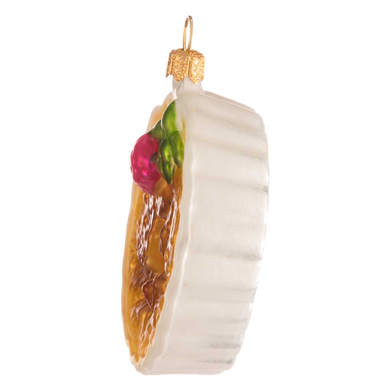 Wie ein echtes Porzellanschälchen - so glänzt die Figur an ihrer Rückseite. Auch der stilecht gewellte Rand kommt wie eine richtige Dessertform daher. Goldgelb schimmert der Inhalt, dessen Oberfläche sich wie eine eingebrochene Zuckerschicht präsentiert. "Creme brulée", folgert der Kenner sofort aus der karamellbraunen Farbe. Wie von Hand flambiert. Eine rosarote Himbeere samt grünem Blättchen ziert außerdem als kleiner Hingucker die köstliche und ziemlich echt aussehende Glas-Süßspeise.