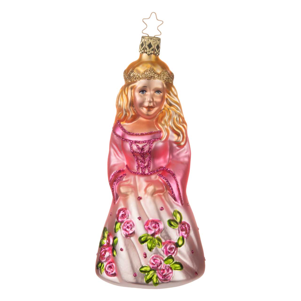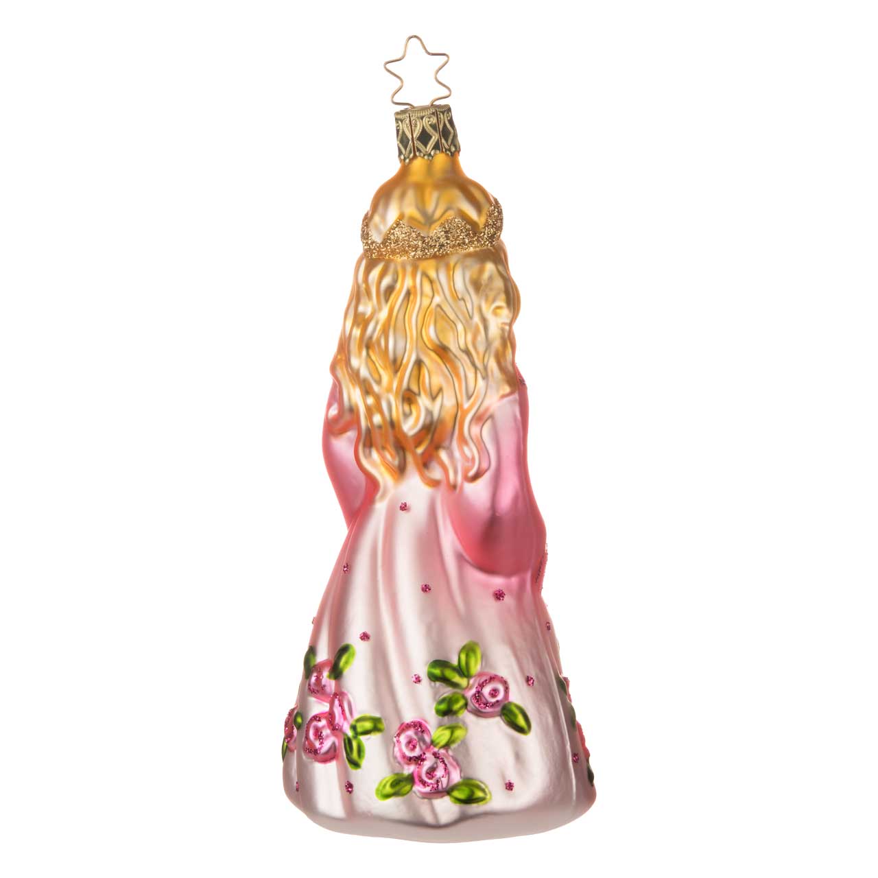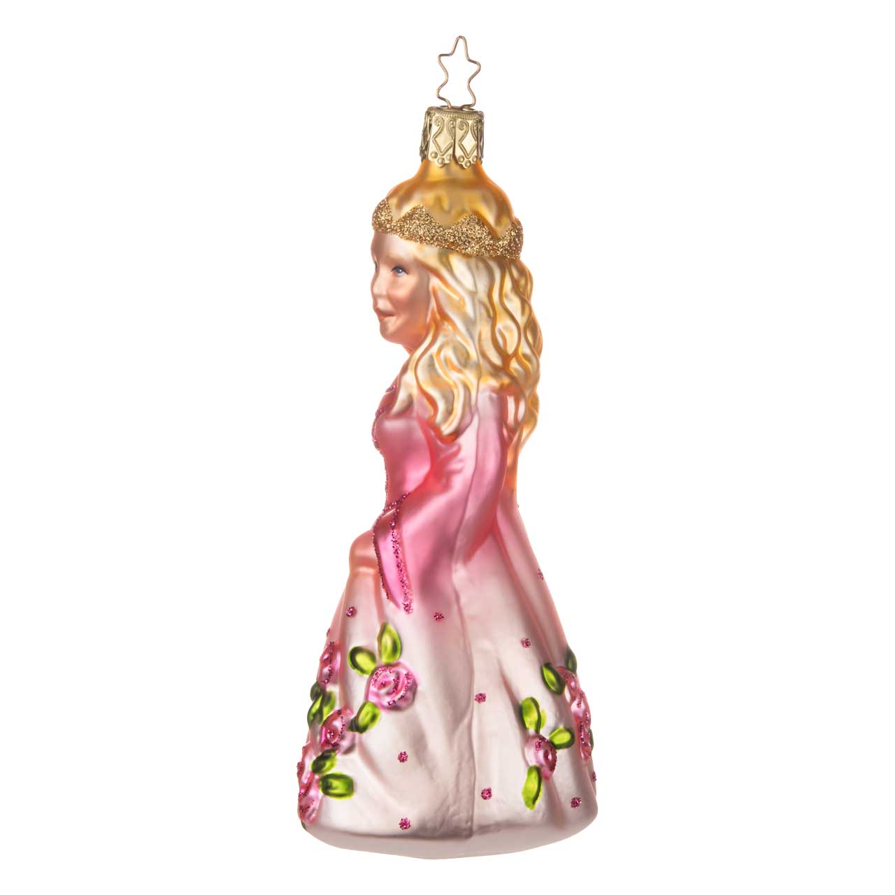 Die Figur zeigt Dornröschen als Prinzessin mit goldenem Haar und einer goldenen Krone. Ihr Kleid ist in kräftigem Rosa und Weiß gestaltet, verziert mit glitzernden Rosenornamenten in Pink und Grün. Die Form ist figürlich, mit fließenden Linien, die den eleganten Fall des Kleides betonen.