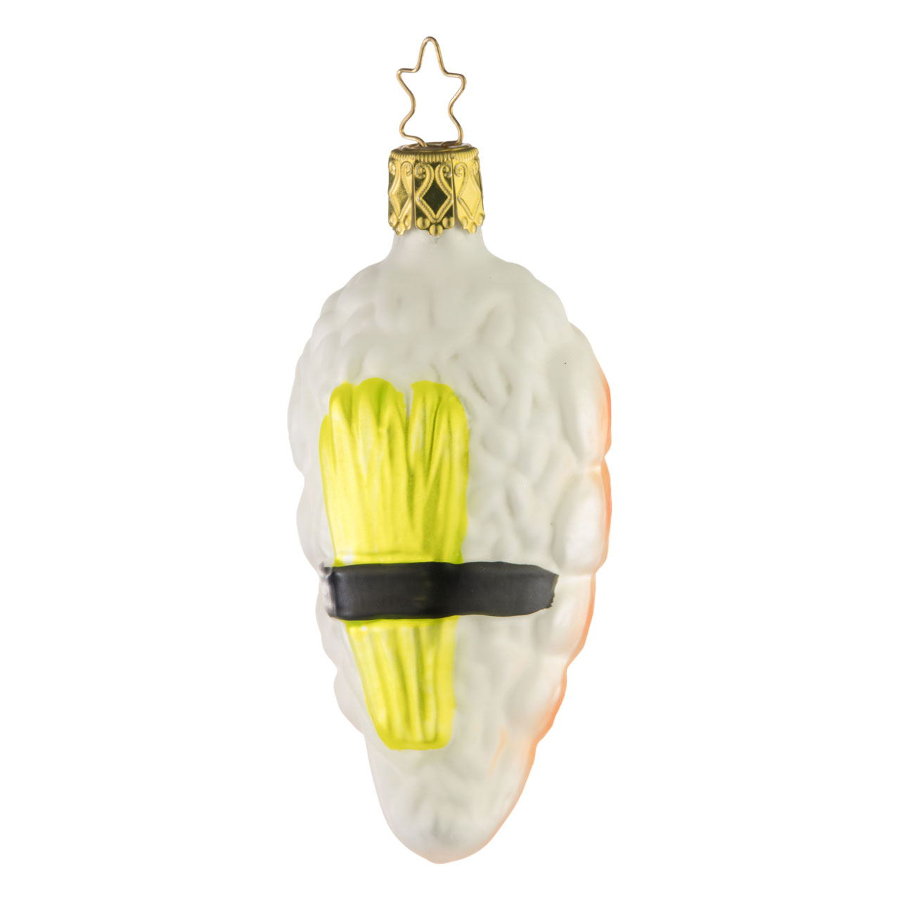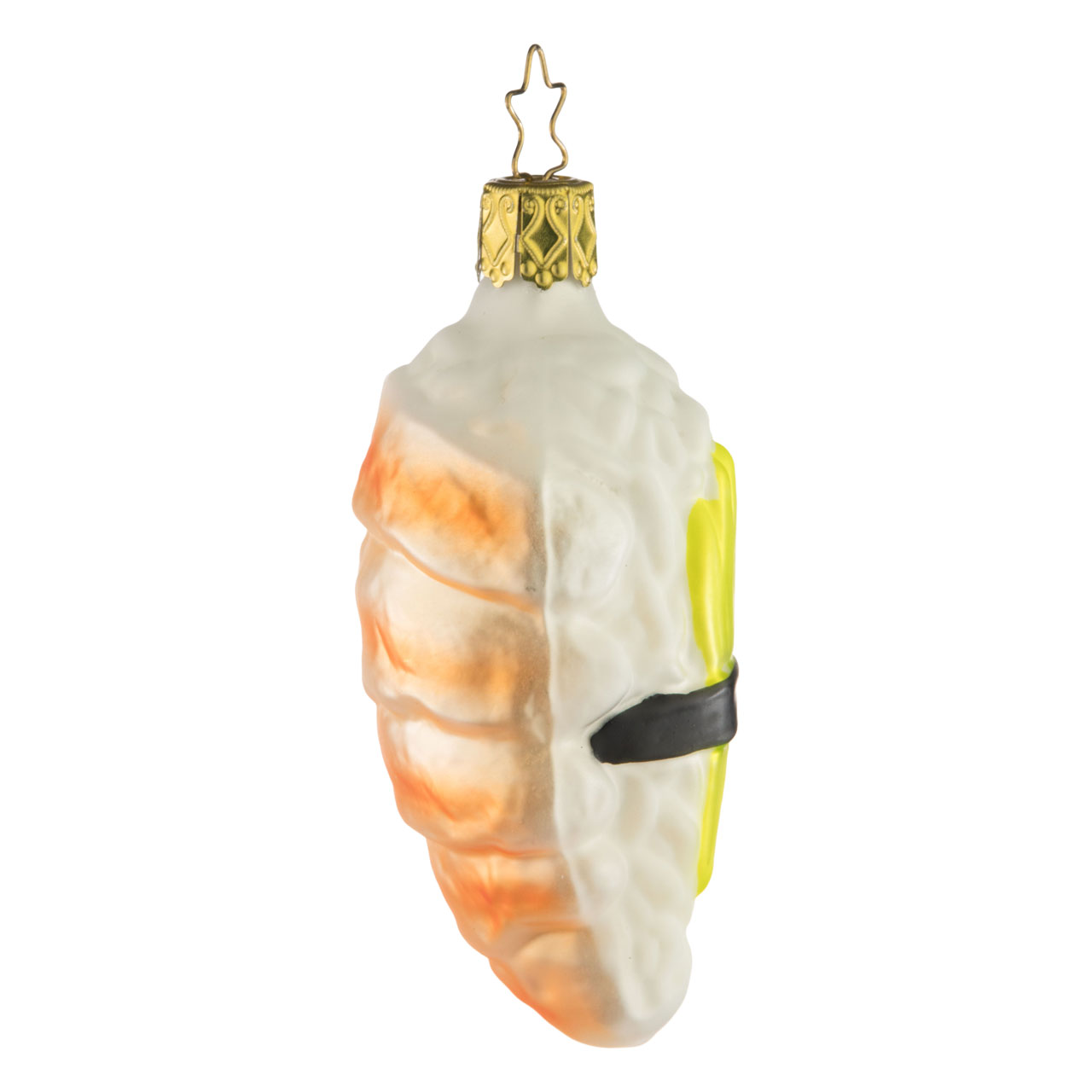 Für Sushi-Fans: Hier kommt der Edel-Happen für den Baum! Ebi Nigiri heißt diese kunstvolle Kreation in Fachsprache; Garnele auf Reisblock für den Einsteigenden. Wobei die gläserne Variante für den kulinarisch dekorierten Tannenbaum im Gegensatz zur gewöhnlichen Sushi-Bar-Praxis zusätzlich an der Unterseite mit einem eleganten, matt dunkelgrünen Streifen Seetang ergänzt wurde, das ein wasabi-grünen Gemüse hält.