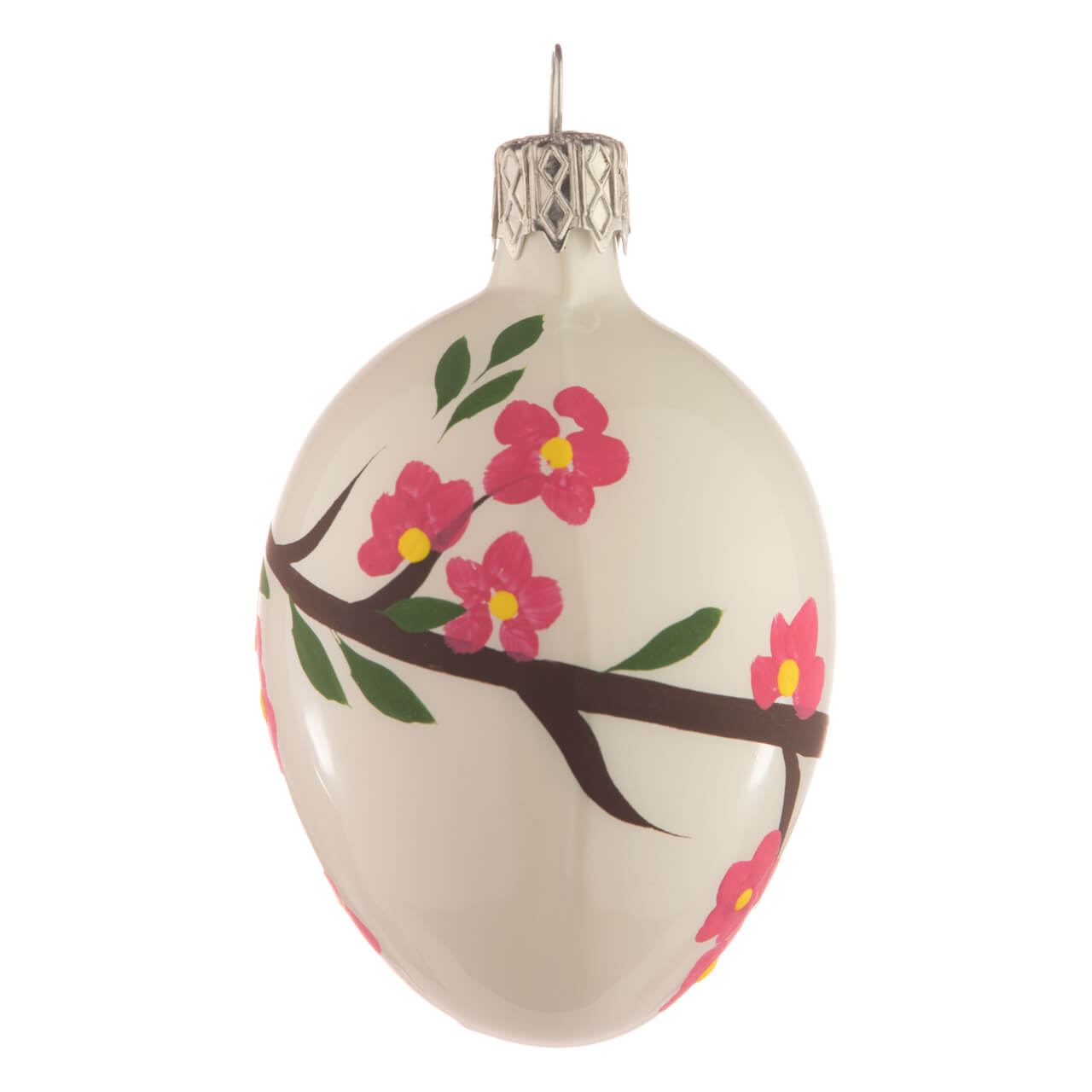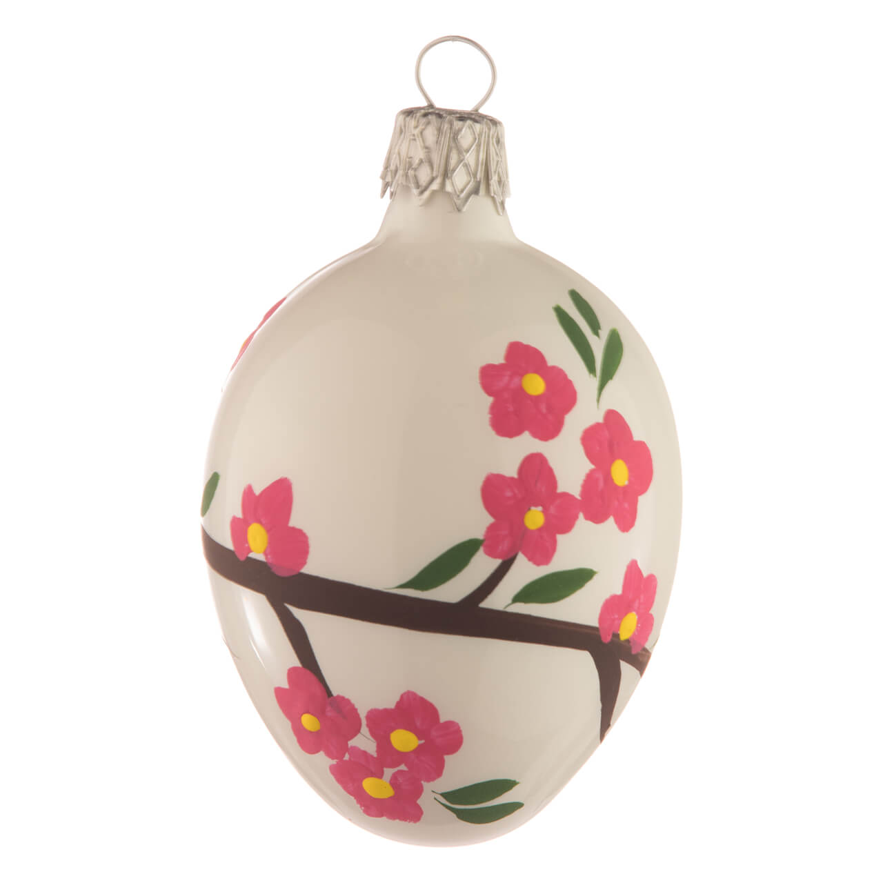 Kräftig pink leuchten die matt lackierten Blumen, deren Mitte jeweils ein gelbes Pünktchen ziert. Viele sind es noch nicht, die den sanft geschwungenen, dunkelbraunen Zweig schmücken - es ist ja auch erst der Frühjahrsbeginn. Dennoch schmücken hier und da auch schon ein paar dunkelgrüne Blätter die zarten Ranken, die einen herrlichen Kontrast zum Untergrund abgeben: Das Ei glänzt höchst elegant in einem satten Weiß als schlichte Basis für die künstlerische Raffinesse.