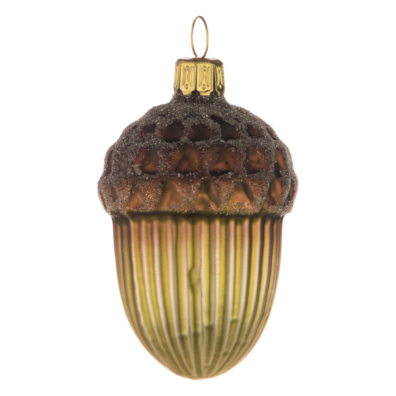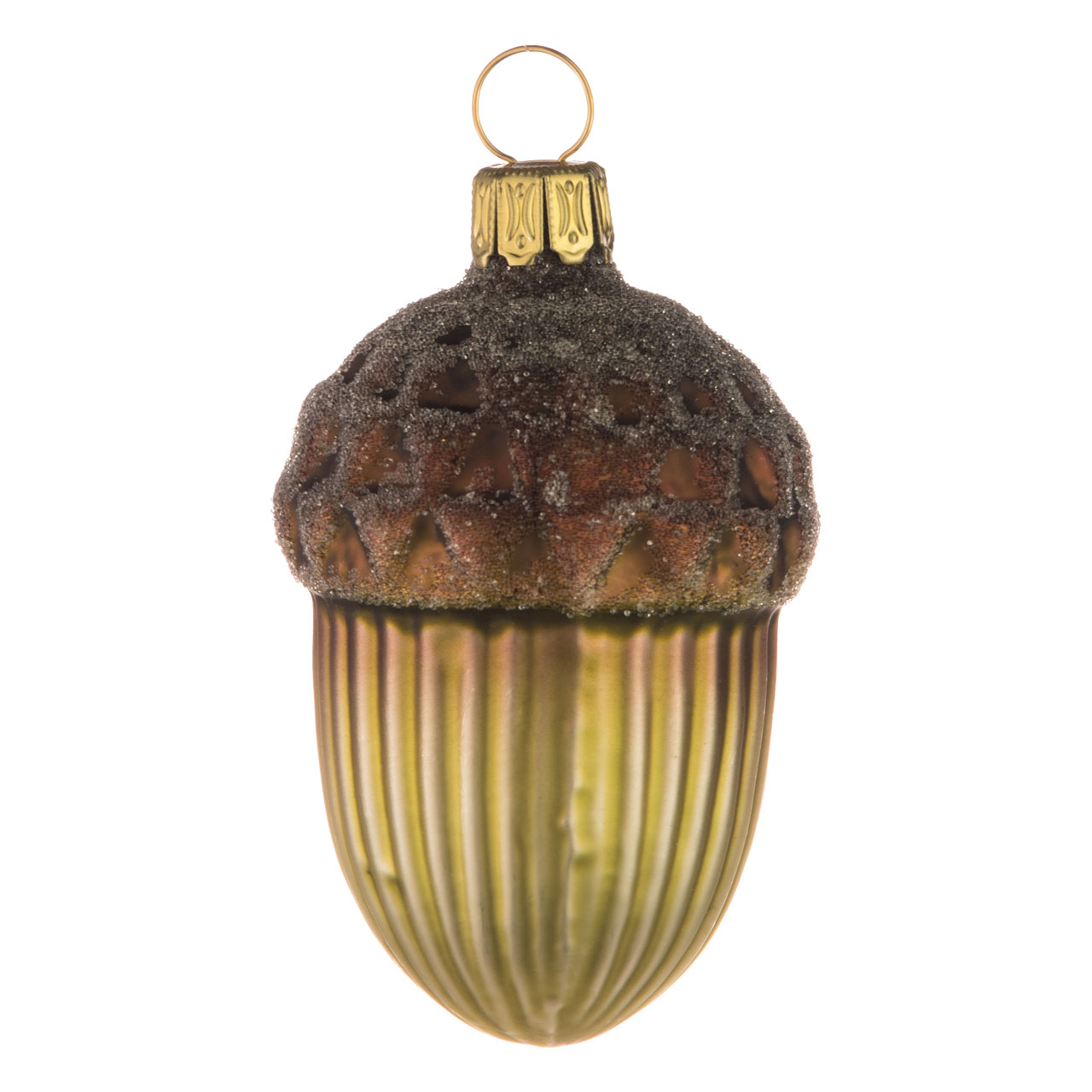 Ein Herbstschatz wie komponiert: Diese Eichel, die nicht nur im wahrsten Sinne des Wortes glasklar zu jeder ordentlichen Herbstdeko dazugehört, veredelt auch jeden Tannenbaum. Die Kappe braun, das Nüsslein in einem hellen, erdigen Grünton gehalten, schimmert sie dabei ganz dezent vom goldenen Krönchen.