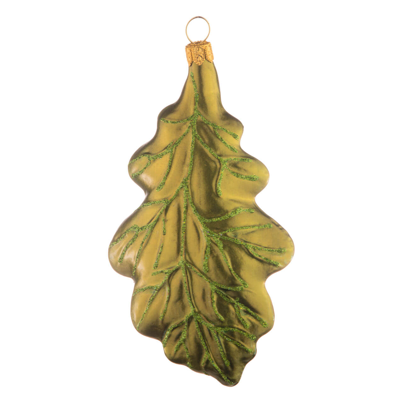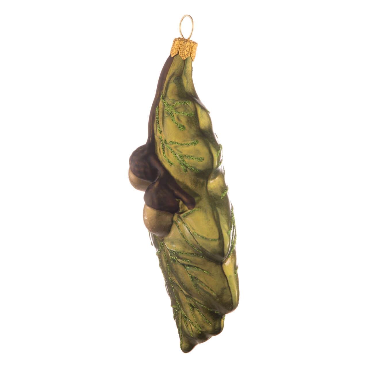Naturalistisch, fein gewölbt und trotz der Glitterelemente doch dezent dank der matten Lackierung - so präsentiert sich diese zarte Glasfigur edel wie elegant und mit der grünen Farbe auch wunderbar zeitlos. Vom goldenen Krönchen senkrecht herab baumelt das berühmte, mehrfingrige Blatt, dessen Adern sorgsam beglittert wurden. Ein dünner, dunkelbrauner Zweig auf der Vorderseite hängt ebenfalls leicht gebogen hinab; an ihm zwei kleine, bronzebraune Eicheln mit dunklen, niedlichen Mützchen. Eben wie an einem echten Baum. Nur festlicher - und welkfrei.