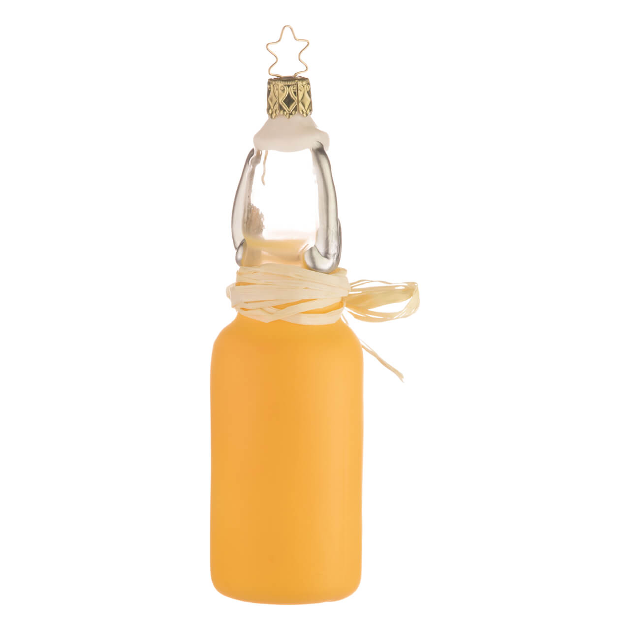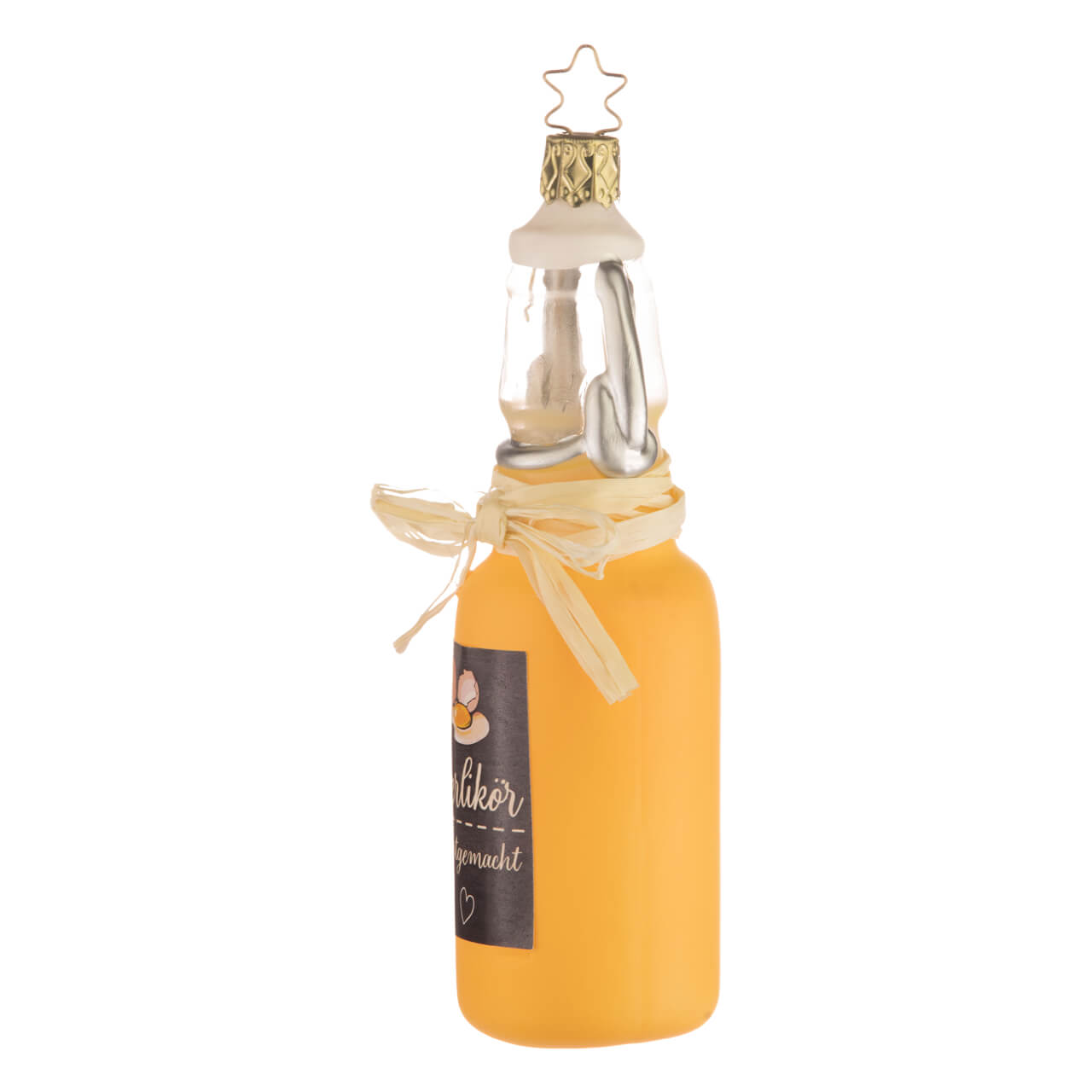 Denn ob am Weihnachtsbaum bei Sahnetorte und Punsch, im verzehrbaren Schokobecher serviert oder frühlingsfrisch als Eyecatcher im Osterstrauß dekoriert - ein Eierlikör passt einfach immer. Erst recht, wenn er in so gewitzter Form daherkommt wie dieser: Aus Glas natürlich, wie sollte es bei einer Flasche auch anders sein, mit herrlich realistisch aufgemaltem, silbernen Bügelverschluss - so präsentiert sich der alkoholische Trunk als Glasfigur wie von Hand abgezapft. Milchiggelb schimmert dabei der Inhalt, über den ein papiernes Etikett unmissverständlich informiert: "Eierlikör" und "selbstgemacht" prangt in weißer Schreibschrift auf tafelschwarzem Hintergrund, hübsch garniert mit einem aufgeschlagenen Ei sowie einem feinen Herz. Eine weiße Papierschleife um den Flaschenhals betont zusätzlich den Geschenkcharakter der raffinierten Figur.