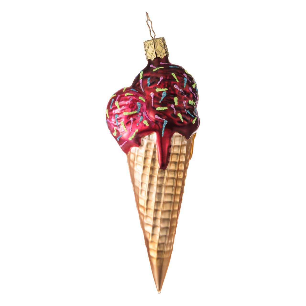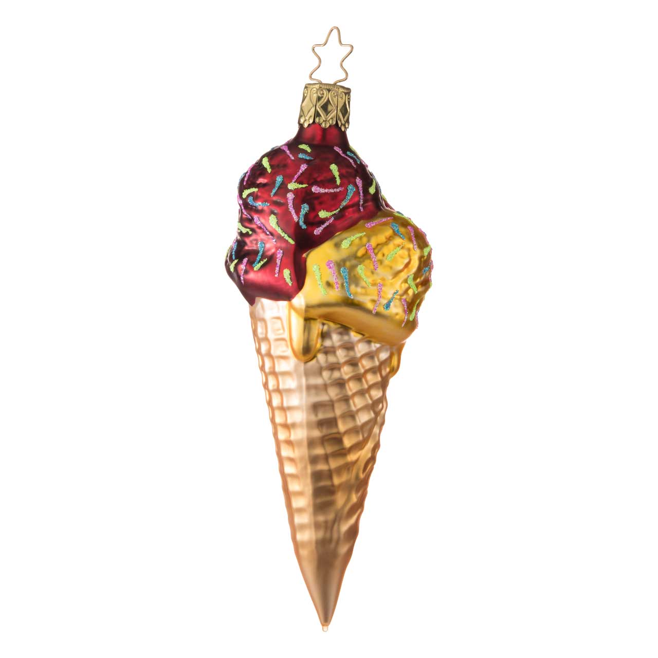 Die Figur zeigt eine längliche Waffel mit zwei üppigen Eiskugeln in kräftigem Rot und zartem Gelb, verziert mit bunten Streuseln. Die Waffel selbst ist in warmen Gold- und Beigetönen gehalten und detailreich strukturiert, wodurch sie besonders lebendig wirkt. Die glänzende Oberfläche unterstreicht den süßen, dekorativen Charakter der Figur.