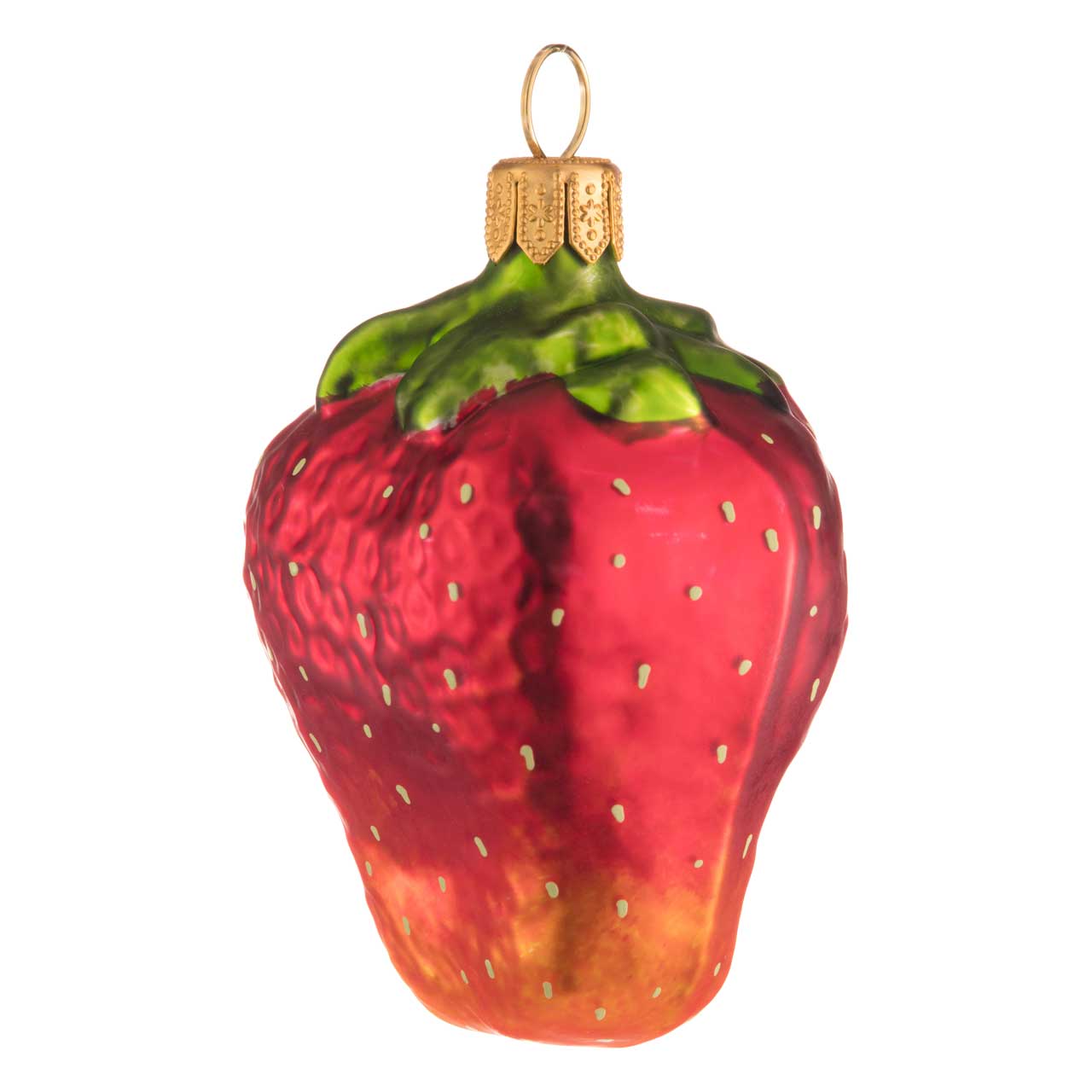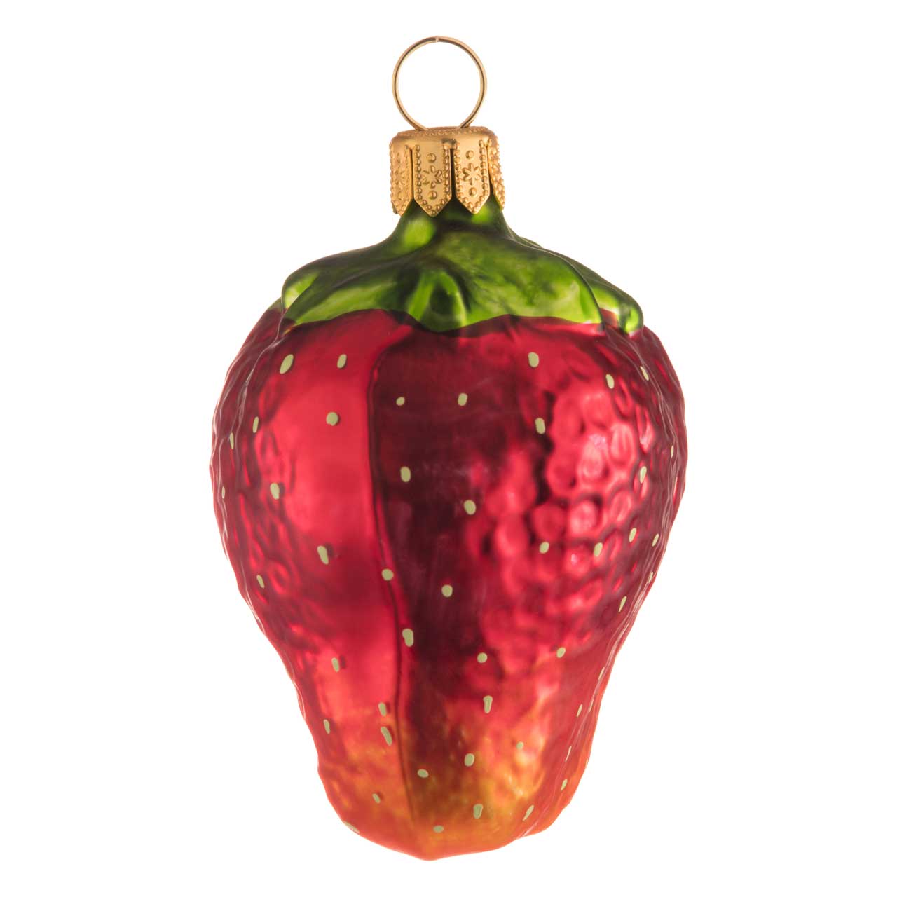 In jedem Fall ein Leckerbissen, und zwar für die Augen, ist diese Erdbeere für den Tannenbaum, die einen praktischen Vorteil hat: Sie dötscht nicht (zumindest nicht bei sorgfältiger Behandlung), sie welkt nicht und schmecken muss sie auch niemandem, sondern nur gefallen. Rot schimmert sie, zur Spitze hin in sanftem Farbverlauf leicht ins Orangefarbene gehend. Gelblich besprenkelt zieren die charakteristischen Nüsslein die Nüssleinsammelfrucht. Ein grünes Blätter-Krönchen bildet das Bindeglied zwischen Erdbeere und goldenem Aufhänge-Krönchen.