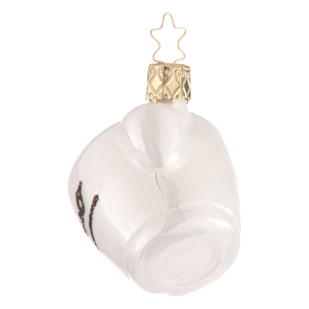 Glänzend weiß wie aus Porzellan ist das schräg baumelnde Gefäß ein echter Hingucker. Dunkelbraun und mit reichlich Glitter verziert, leuchtet in der Mitte - voll gefüllt - das köstliche Getränk. Und um allen Fragen gleich eindeutig entgegen zu wirken, wurde mit schnörkeliger Glitzerschrift der Name des berühmten Käffchens auf die Vorderseite des Gefäßes aufgetragen: Espresso.