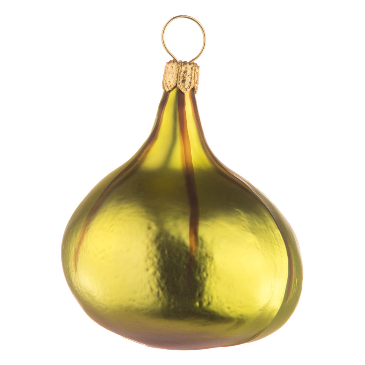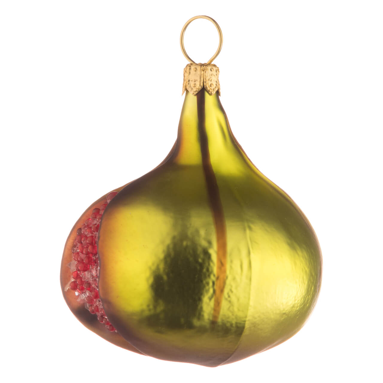 Klingt kompliziert? Ist aber lecker und - zumindest als gläserne Figur für den Tannenbaum auch äußerst dekorativ. Hellgrün mit einem zarten, bräunlichen Schimmer am Rand der wie aufgeplatzten Stelle an der Seite, so schimmert der bauchig wie eine Laute gewölbte Leckerbissen edel und matt. Mit sorgsamem Pinselstrich aufgetragen verzieren braune, senkrechte Linien die Außenhülle. Und innen? Da leuchtet es nahezu dramatisch rot! Denn um das saftige Fruchtfleisch besonders realistisch darzustellen, wurden hier jede Menge durchscheinende, rote Kügelchen samt durchsichtigen Glittersplittern aufgetragen, die für einen wahren Frischekick sorgen.