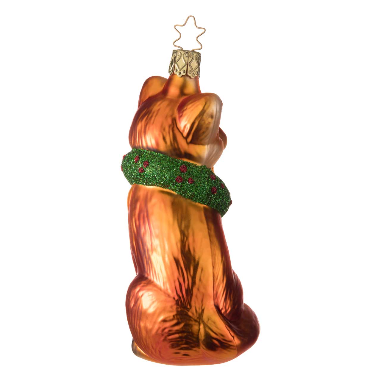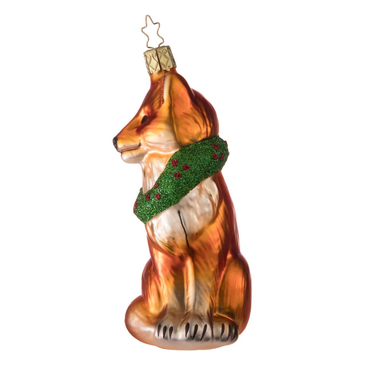 Die Figur zeigt einen sitzenden Fuchs in eleganter, leicht geschwungener Form. Sein Fell schimmert in warmen Rot-, Orange- und Goldtönen, ergänzt durch weiße Akzente im Brustbereich. Um den Hals trägt er einen grünen, glitzernden Kranz mit kleinen roten Details. Die Kugel ist detailreich gearbeitet und verbindet eine natürliche Tierform mit festlichen Farben zu einem charmanten Blickfang.
