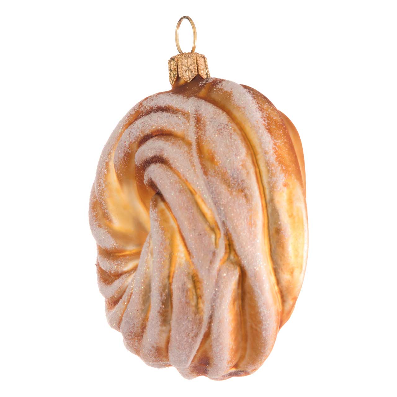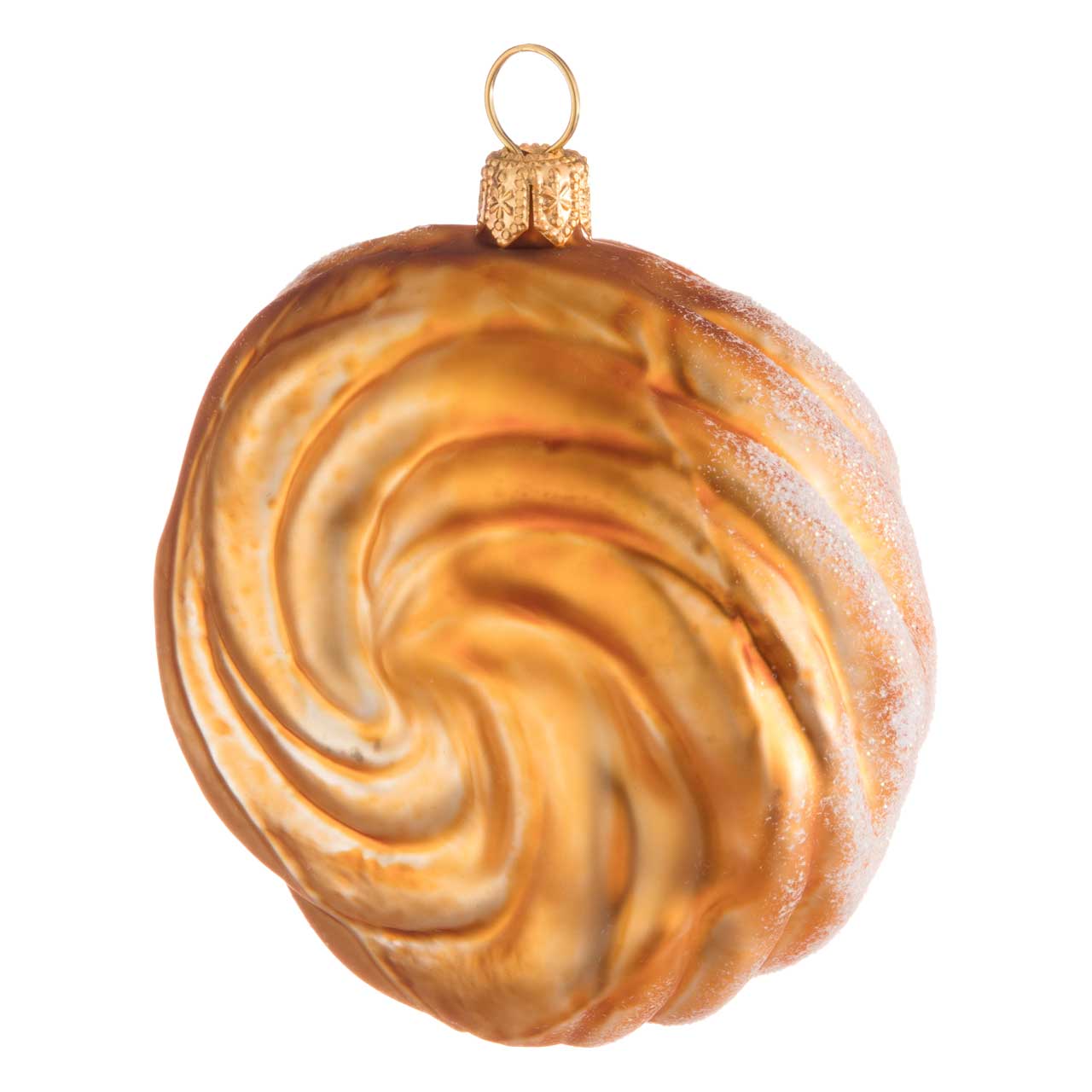 Ein besonders schmackhaftes Teilchen selbiger Sorte kommt hier nun als Glasfigur für den Tannenbaum: Hellbraun schimmert es, wie frisch aus dem Ölbad und ziemlich verführerisch, während der Teig sich übrigens spiralförmig zu einer Schnecke formt. Weißer Gitterstaub, mit dem die Oberseite betupft wurde, erscheint wie echter Puderzucker und lässt sofort an Weihnachtsmarktbuden denken. Und an duftende Karrusselfahrten mit fettiger Papiertüte in der Hand und Zuckerkrümeln auf den Lippen.