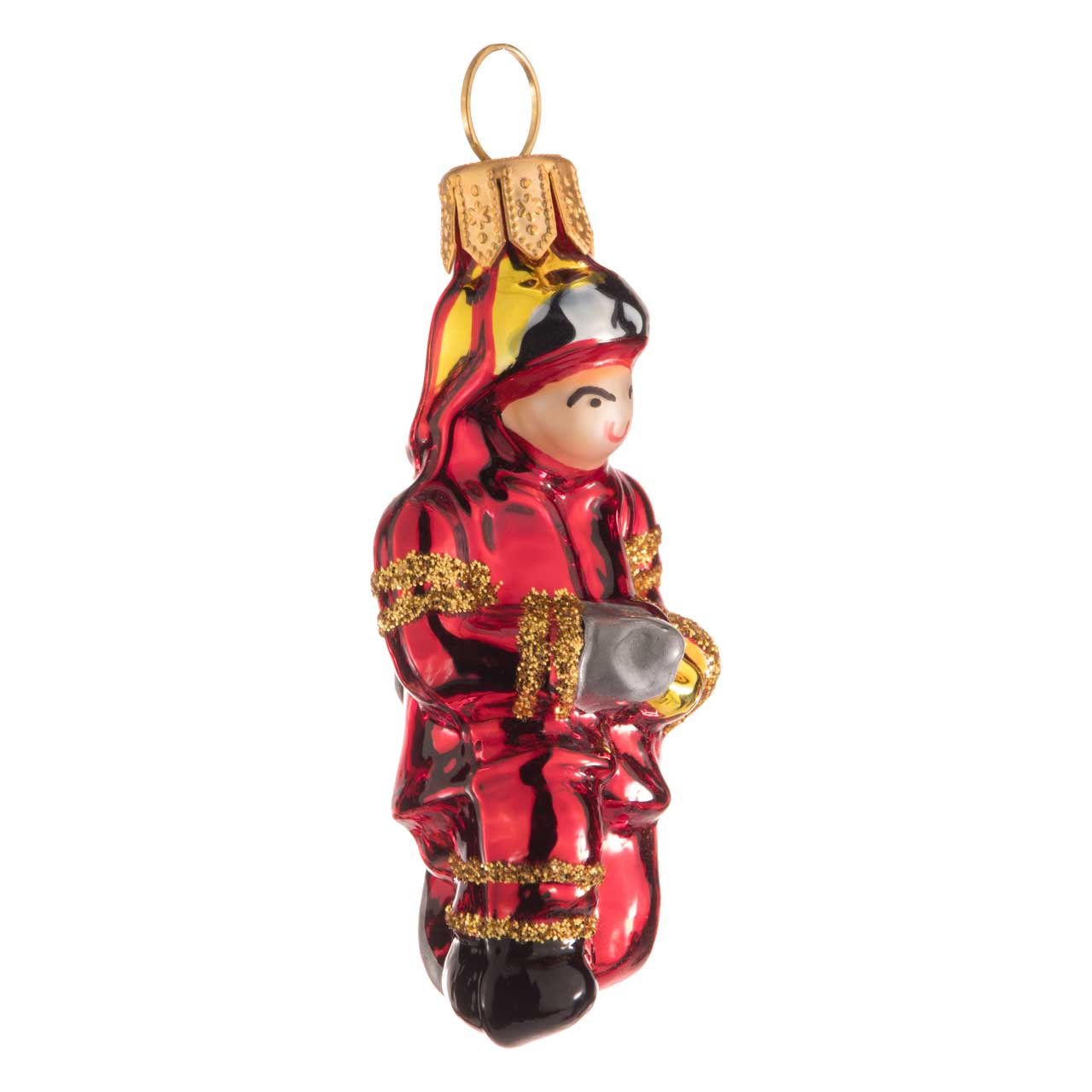 Auch dieser kleine, feine Feuerwehrmann legt nicht nur einen glänzenden Auftritt mit seiner lackschwarzen beziehungsweise feuerroten Uniform und den goldenen Glitzerstreifen hin. Details wie der goldrote Helm mit hochgeschobenem Visier, das kleine aufgemalte Gesicht, die silberne Sauerstoffflasche auf dem Rücken oder das silberne Strahlrohr in der Hand werden den heiligen Florian vermutlich genauso entzücken wie die einsatzbereite Pose mit dem zum Knien abgewickelten linken Bein.