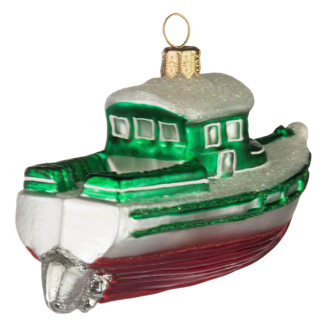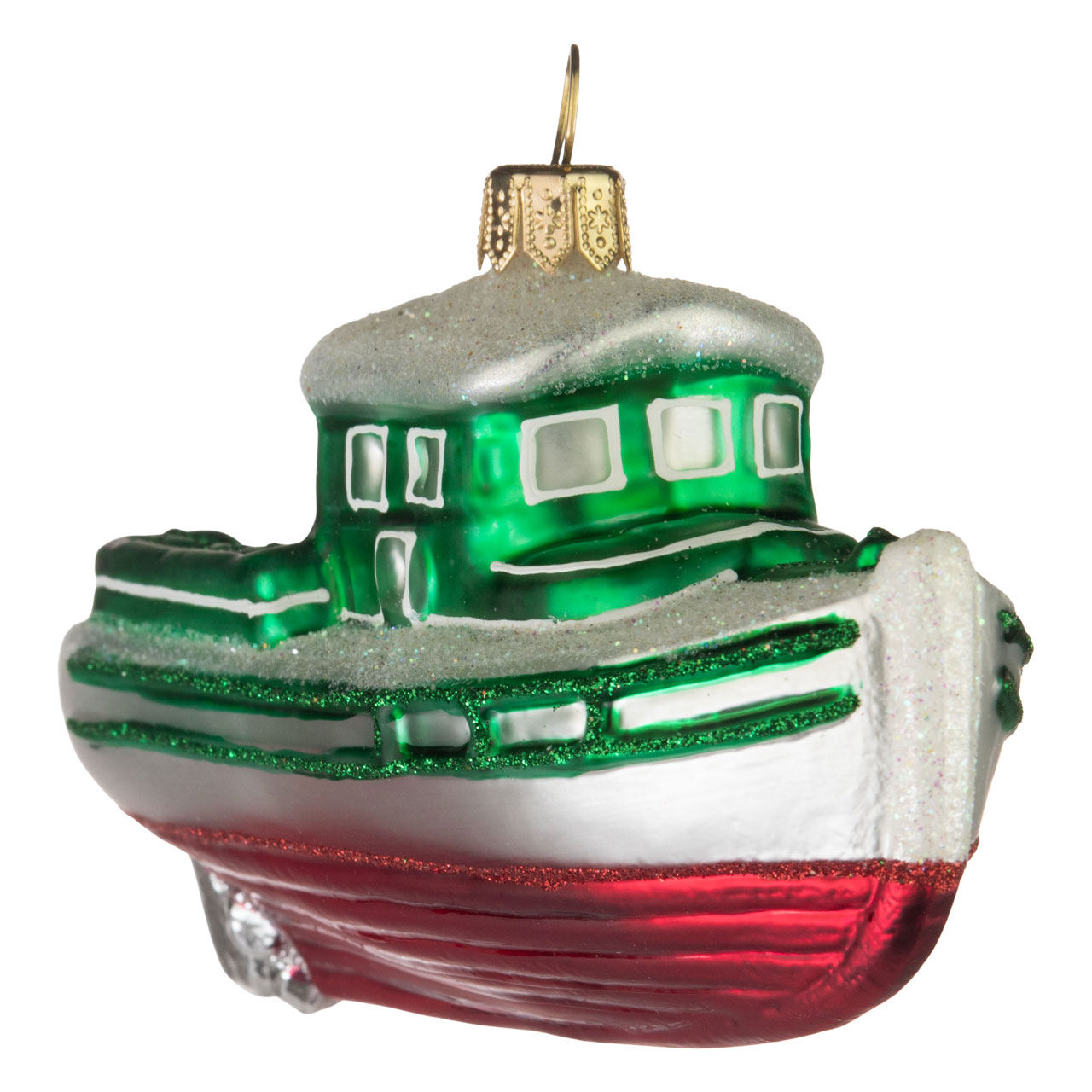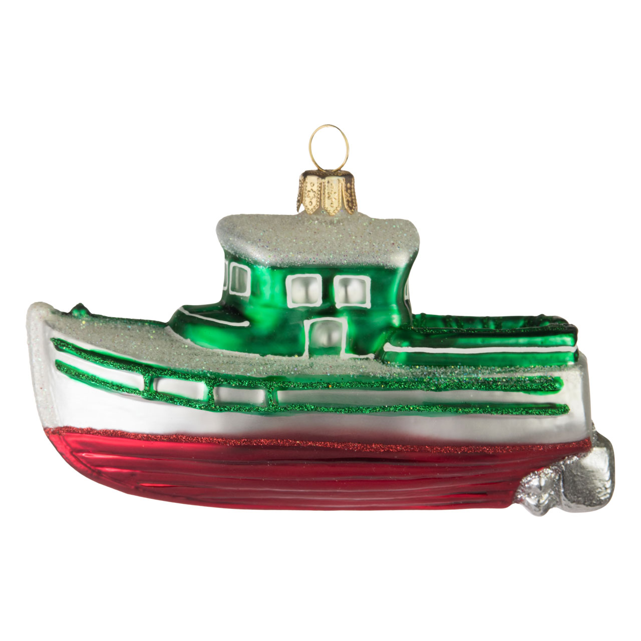In festlichem Rot, allerdings zurückhaltend matt präsentiert sich der sanft geschwungene Rumpf, den unter einer roten Glitterlinie elegante glänzende Längsrillen zieren. Mattweiß und schlicht schimmert darüber die Bordwand, die wiederum in eine grün beglitzerte Reling mündet. Auch das zweigeschossige Führerhäuschen sowie die Aufbauten im Heck schimmern in edlen Grünton und weisen zusätzlich grün glitzernde und weiße Konturen auf. Wie mit weißem Schnee bestäubt glimmern Dach und Deck und sorgen durch das harmonische Farbenspiel für weihnachtliche Assoziationen.
