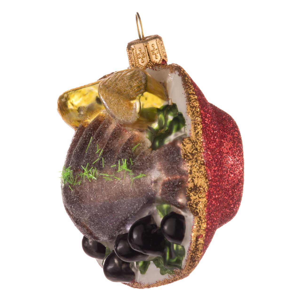 Die Fischplatte für den Weihnachtsbaum bringt ihn daher gleich länglich, prachtvoll und inklusive köstlicher Beilagendekoration an den Tannenzweig. Festlich rot glitzernd und gold gerändert zieht dabei schon die Unterseite erste neugierige Blicke an, die oben oder besser gesagt vorne drauf einen wahren Augenschmaus erleben dürfen. Auf einem deftigen, matt dunkelgrün lackierten Spinatbett thront der besagte, dicke Fisch sanft braungrau schimmernd unter einer eisig-weißen Glitterstaubschicht. Matt schwarze, dicke Kugeln auf der einen Seite lassen an Wacholderbeeren denken. Zwei gelbe Zitronenstücke auf der anderen sorgen für frische Würze ebenso wie die wasabigrün leuchtenden Dillstreusel, das Topping auf dem edlen Fisch.