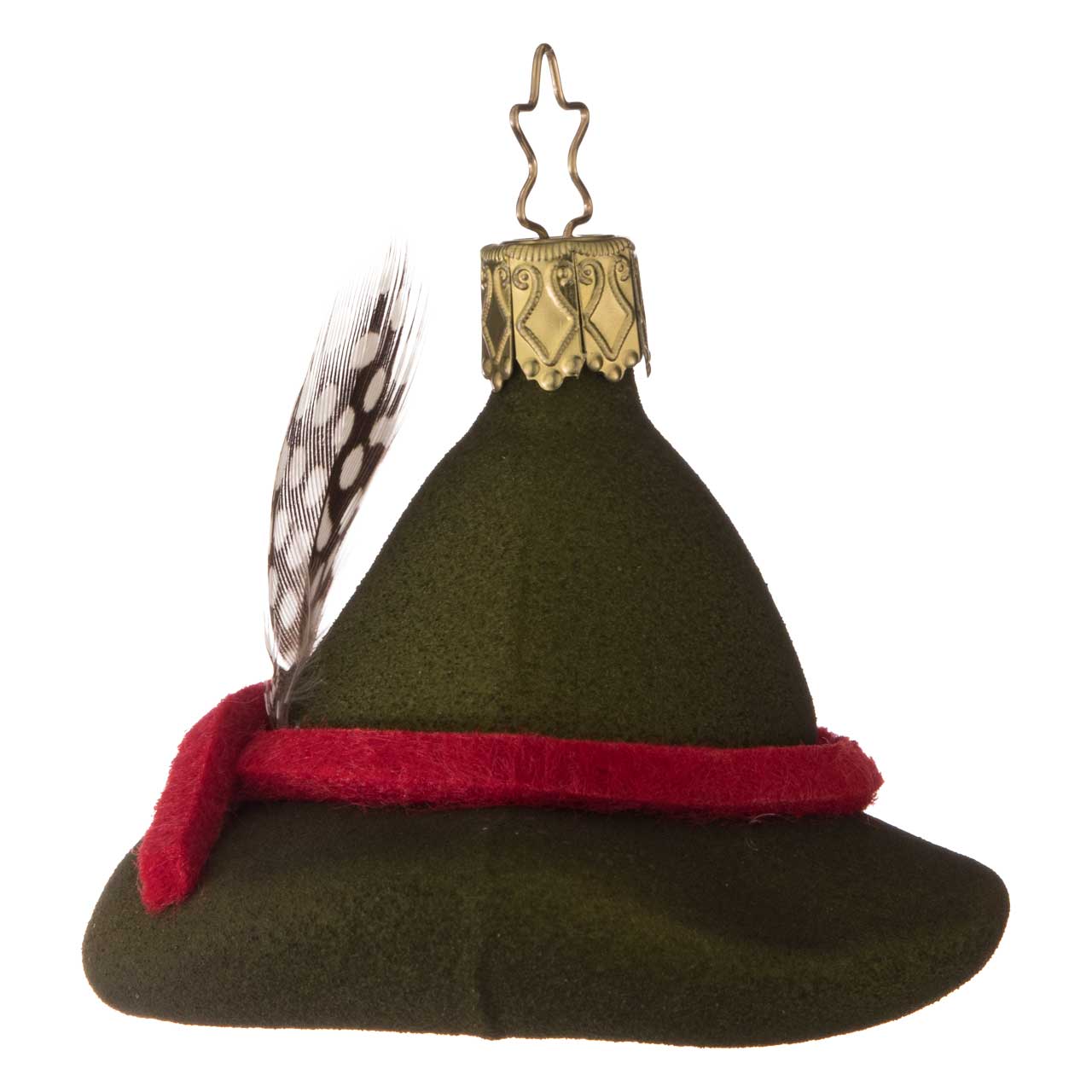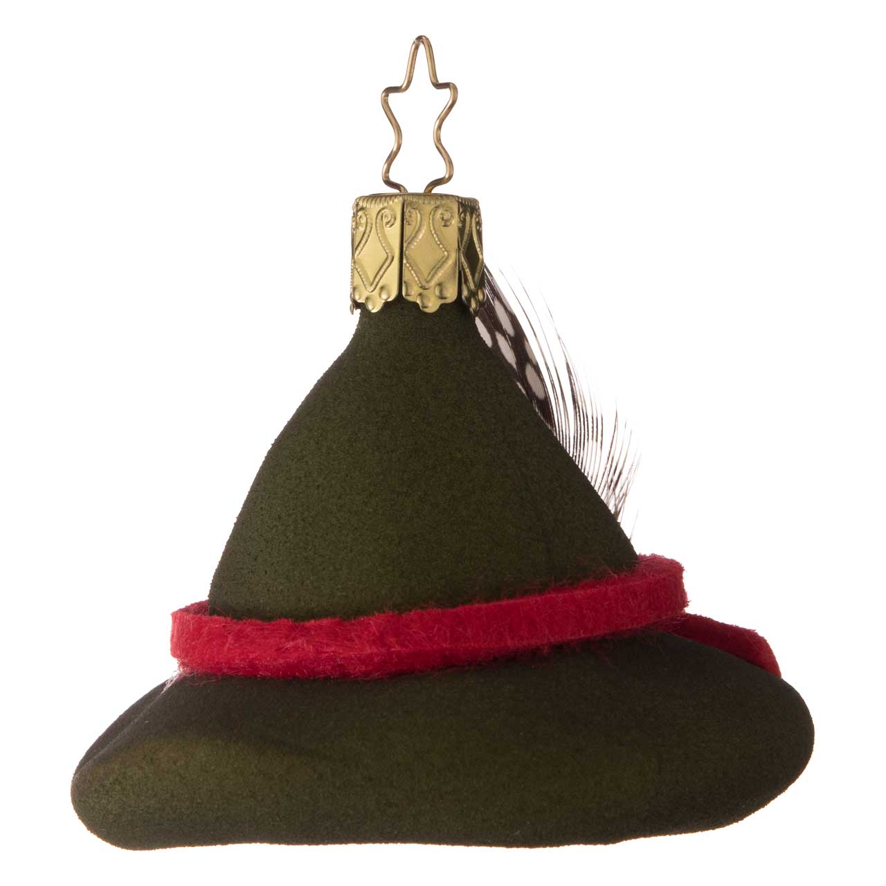 Die Figur ist einem klassischen Försterhut nachempfunden, mit breiter Krempe und leicht gewölbter Krone. Sie zeigt sich in einem tiefen, matten Grün und wird durch ein rotes Band sowie eine kleine, detailreiche Feder akzentuiert. Die Kugel verbindet eine weiche, textile Optik mit klarer Formgebung und wirkt dadurch besonders authentisch und charmant.