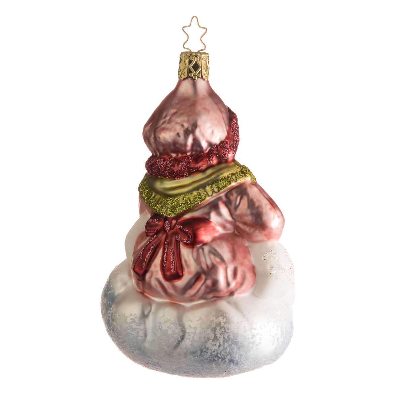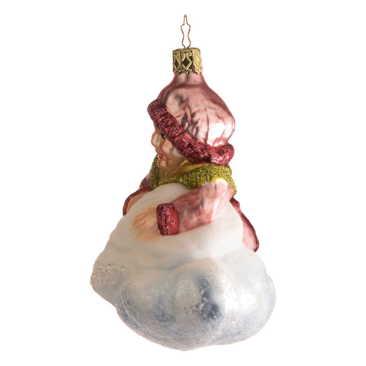 Zart bläulich schimmert das weiße, weiß beglitzerte Himmelsgebilde, das gleichzeitig ihr Sockel ist. Einen markanten Kontrast formt das matt rosafarbene Kleid der alten Dame mit beerenroten Bündchen und Schleife. Eine passende Schlafhaube umhüllt das freundliche Gesicht. Ein hellgrünes, ebenfalls beglittertes Fransentuch wärmt Schultern und Hals.