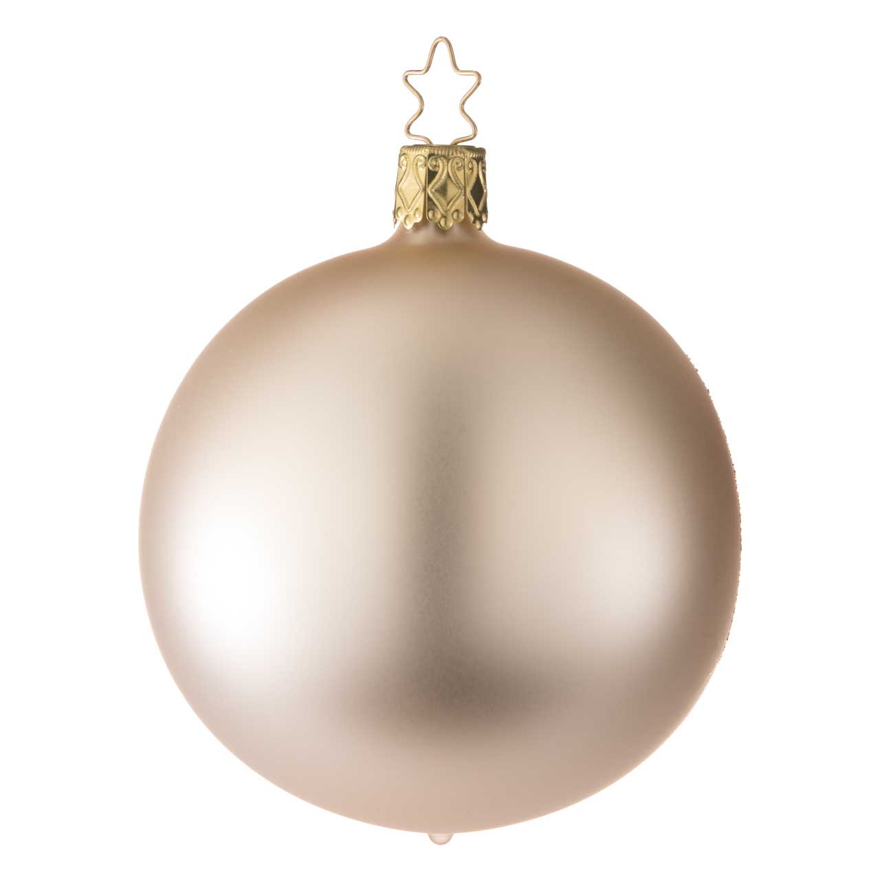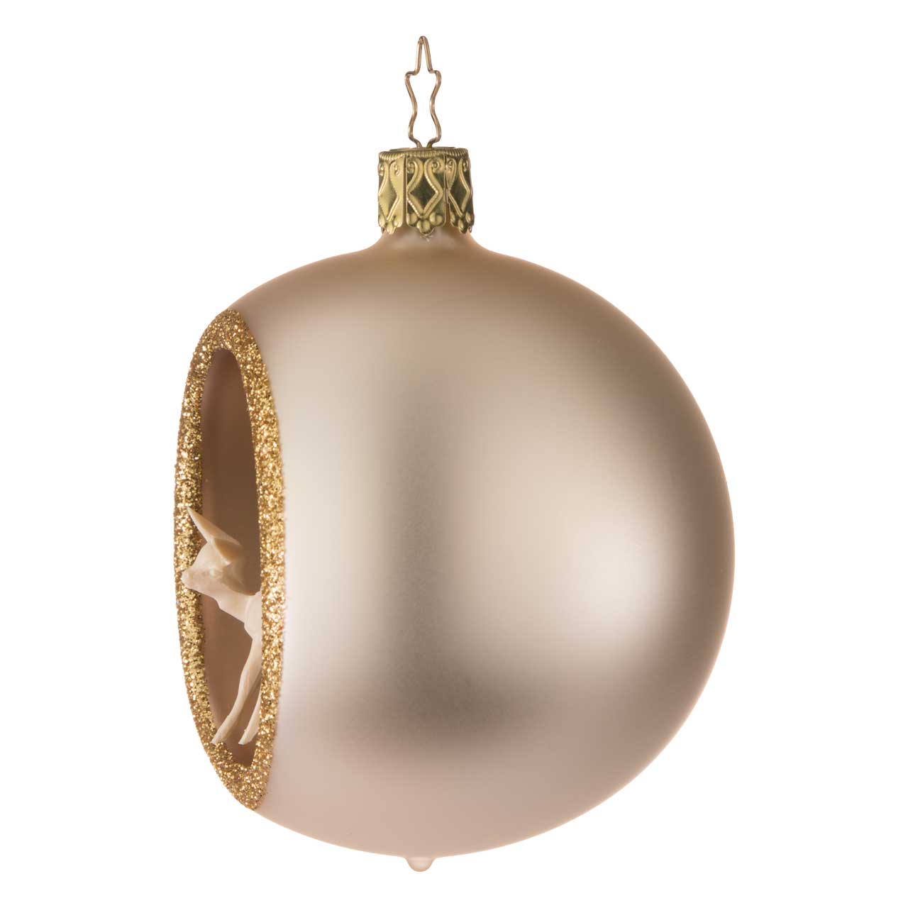 Die Kugel ist klassisch rund gehalten und in einem edlen, matten Champagnerton gestaltet. Eine seitliche Öffnung mit golden glitzerndem Rand gibt den Blick auf die detailreiche Szene im Inneren frei: ein filigraner, dunkler Tannenbaum und ein zartes, helles Reh. Die Figur wirkt elegant, ruhig und hochwertig – ein kleines, stimmungsvolles Winterpanorama in harmonischen Natur- und Goldtönen.