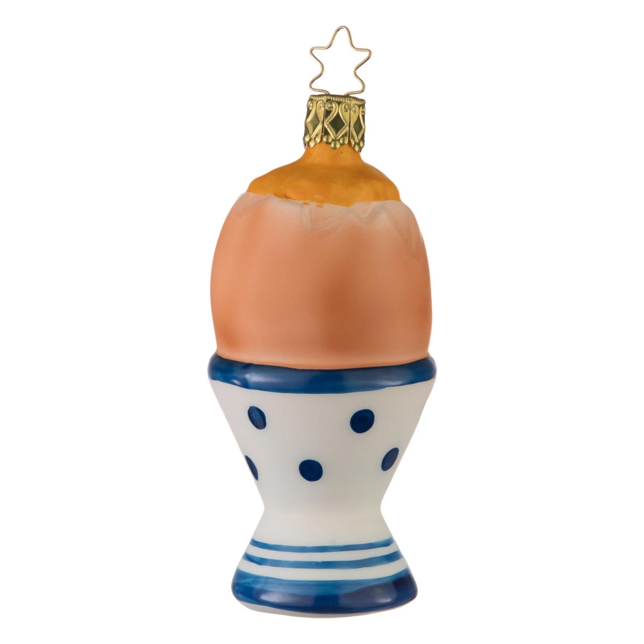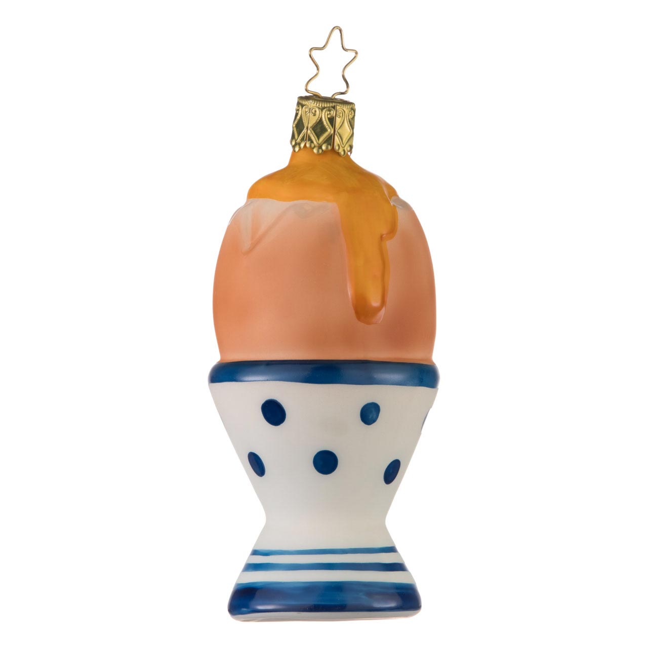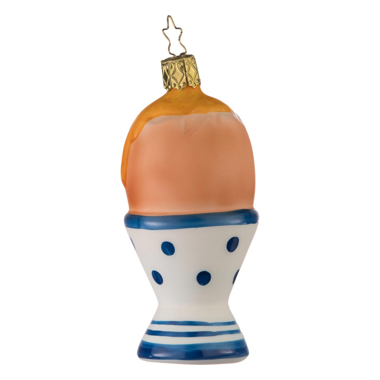 ... vor allem, wenn sie in einem so präsentablen wie schönen Eierbecher serviert wird wie bei dieser Christbaumfigur. Täuschend echt wurde der Becher in weiß mit filigranen, blauen Linien und Punkten bemalt als wäre er aus Porzellan. Das Ei darin schimmert matt mit bräunlicher Schale. Oben selbstverständlich geköpft, so dass der gelbe Dotter verführerisch an einer Seite herausläuft.