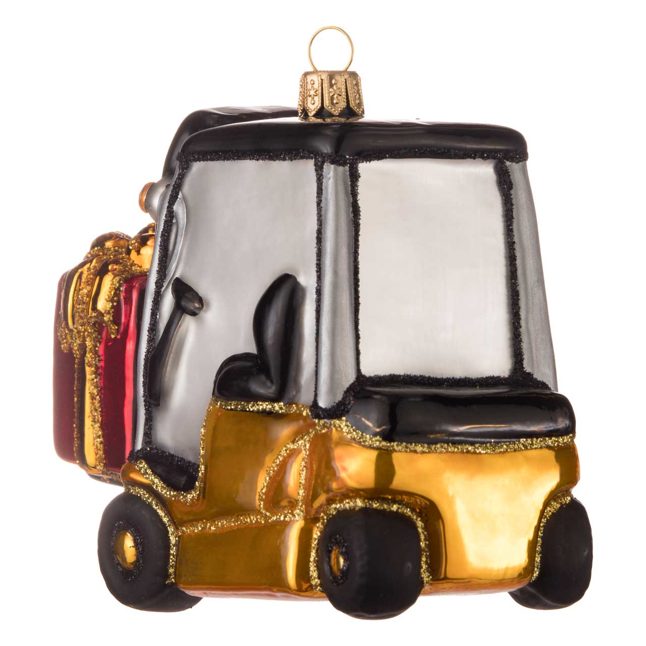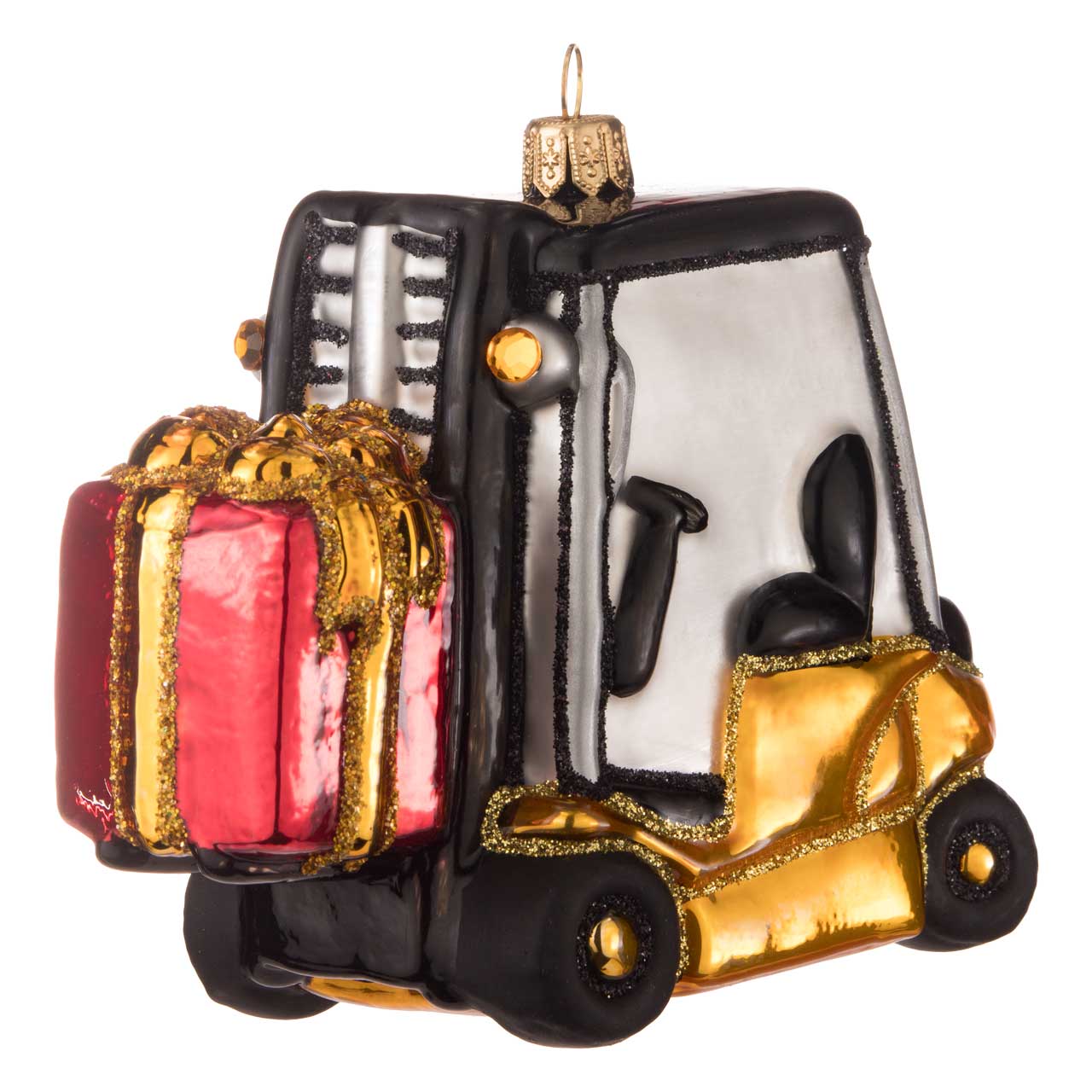 Der Gabelstapler mit seiner gelben Karosserie und schwarzen Rädern, Sitz und Hebezeug zieht in dieser Farbgebung sicherlich in so manchem Logistik-Zentrum seine Kreise. Die glitzernde Borte, die diesem Fahrzeug ein gewissen Glanz verleiht, wird dort aber fehlen. Ein großes, glänzend rot verpacktes Geschenk befindet sich auf der Gabel. Eine gelbe Band mit einem glitzernden Rand sichert und ziert das Paket auf der Oberseite mit einer üppigen Schleife.