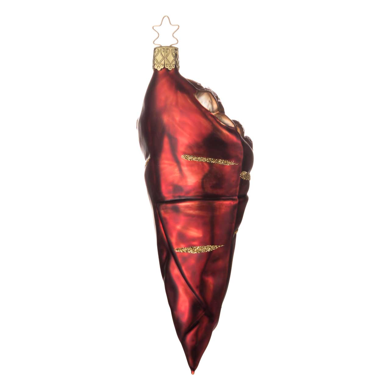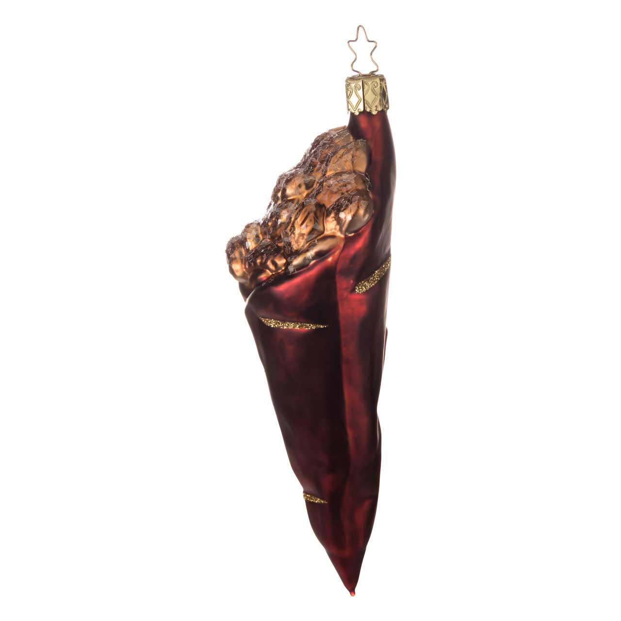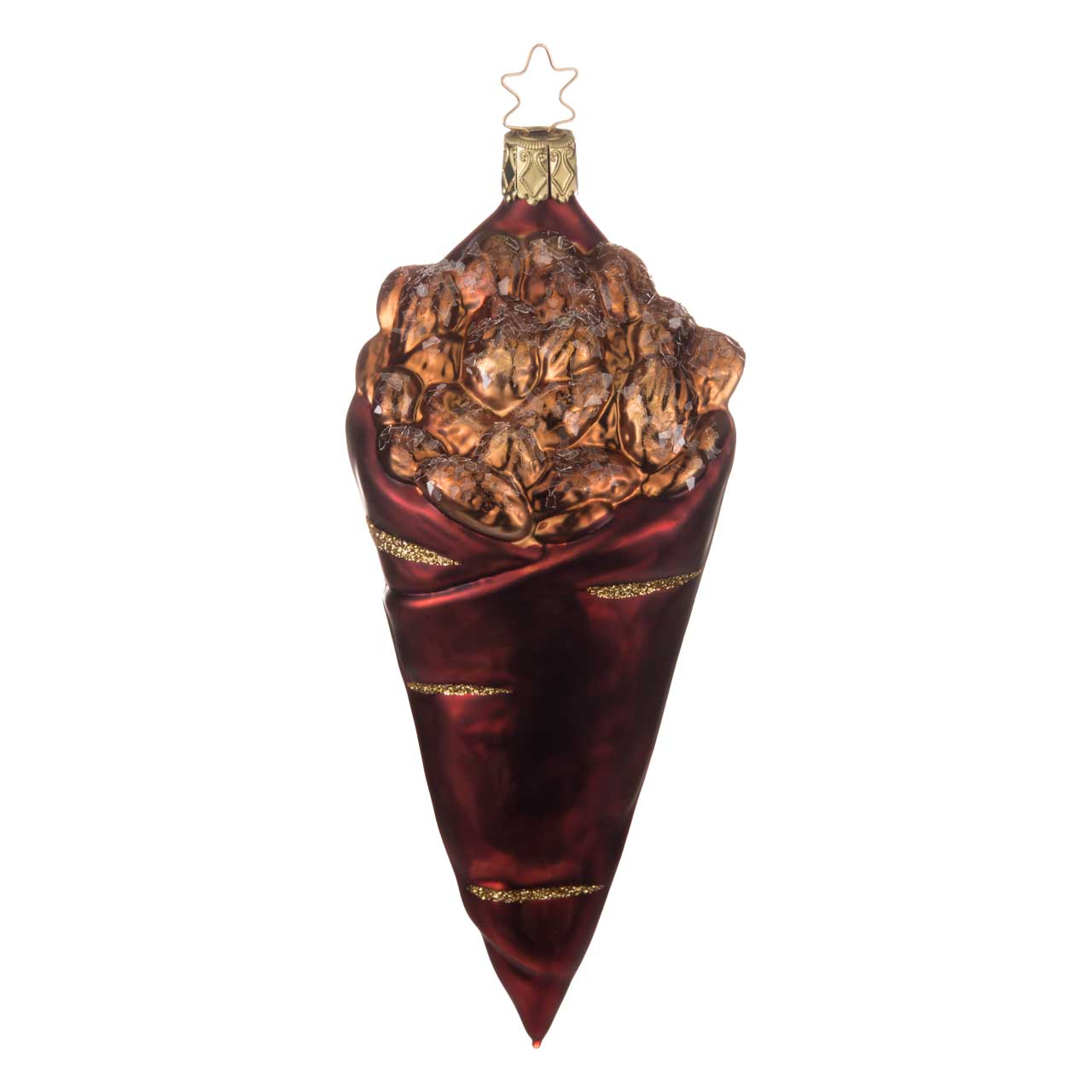 Eine rot-goldene Tüte, prall gefüllt mit glänzend braun bemalten Mandeln, die detailgetreu und täuschend echt gestaltet sind. Mit ihrer länglichen, spitz zulaufenden Form und den warmen Farben erinnert sie sofort an den weihnachtlichen Marktbummel und bringt eine besonders stimmungsvolle Note an den Baum.