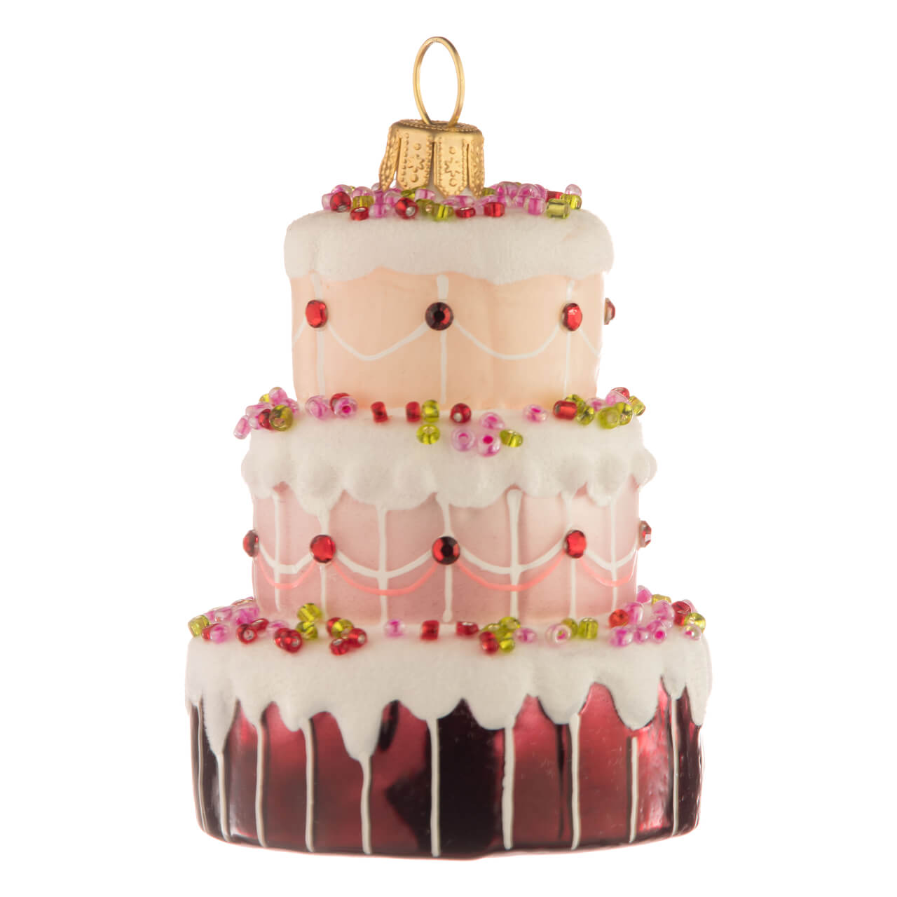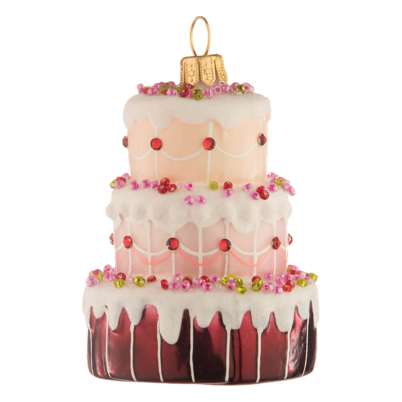 So bildet ein schokobraun glänzender, breiter Sockel die unterste Ebene, die Basis, welche sich durch ihre feinen, weißen Längsstreifen geschickt gestreckt präsentiert. Etage Numero zwei kommt in einem matten Rosaton daher. Hier schmücken die Senkrechtstreifen zudem rosa und weiße Ranken sowie rot glitzernde Strasssteine, die akkurat auf jedem zweiten Knotenpunkt platziert wurden. Etwas schlichter geht es dann wieder in Stockwerk Nummer drei zu, das zwar ebenfalls mit rotem Strass, dafür aber mit weniger Zuckergusslinien verziert wurde. Üppiger Abschluss: Jede Etage wurde mit einem dicken, weiß beflockten sowie übertropfenden, sahnigen Lack garniert, auf dem Streusel-gleich rosa, rote und grüne Glasperlen dekoriert wurden.