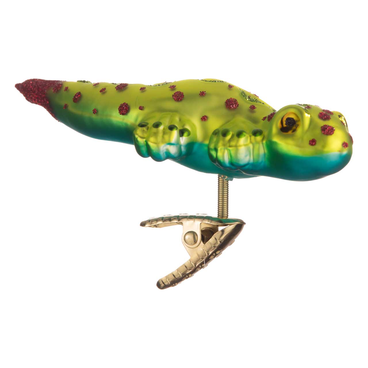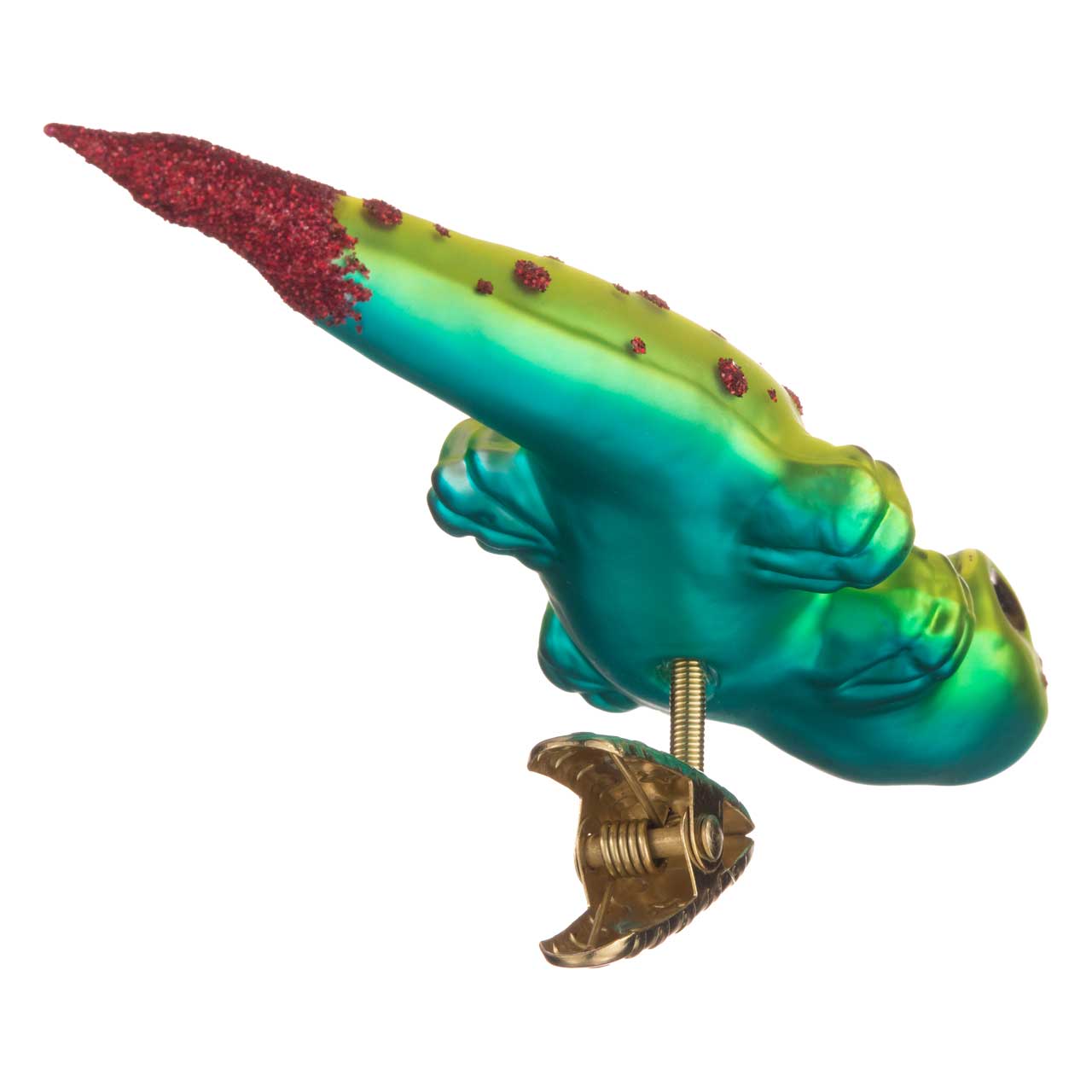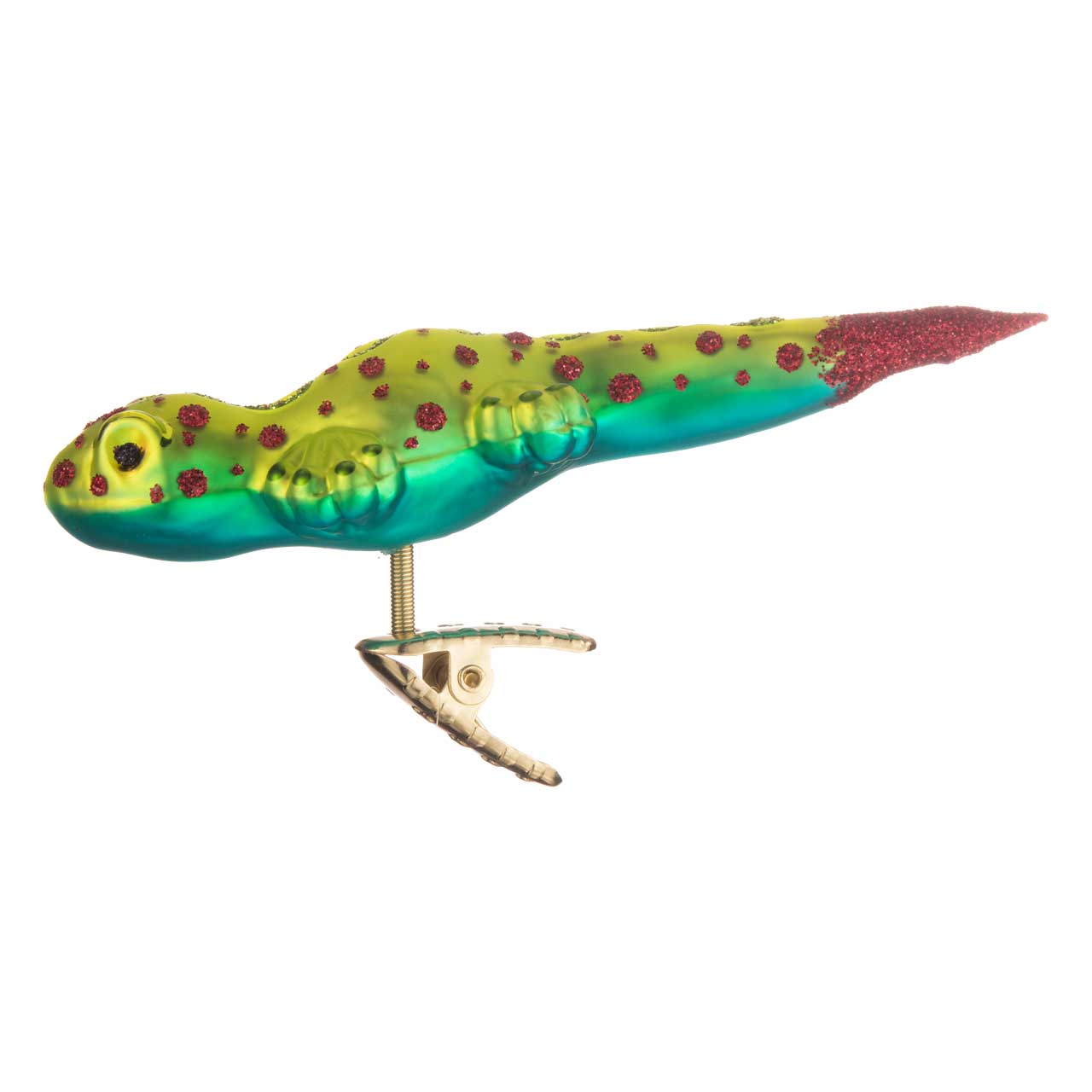 Die Figur zeigt einen länglichen Gecko mit leuchtend grünem Körper, türkisfarbenem Bauch und auffälligen roten Glitzerpunkten. Die Form ist flach und gestreckt, mit fein ausgearbeiteten Pfoten und einem aufmerksam blickenden Kopf. Die glänzende Farbgebung und die Glitzer-Details verleihen dem Tier eine lebendige Ausstrahlung.