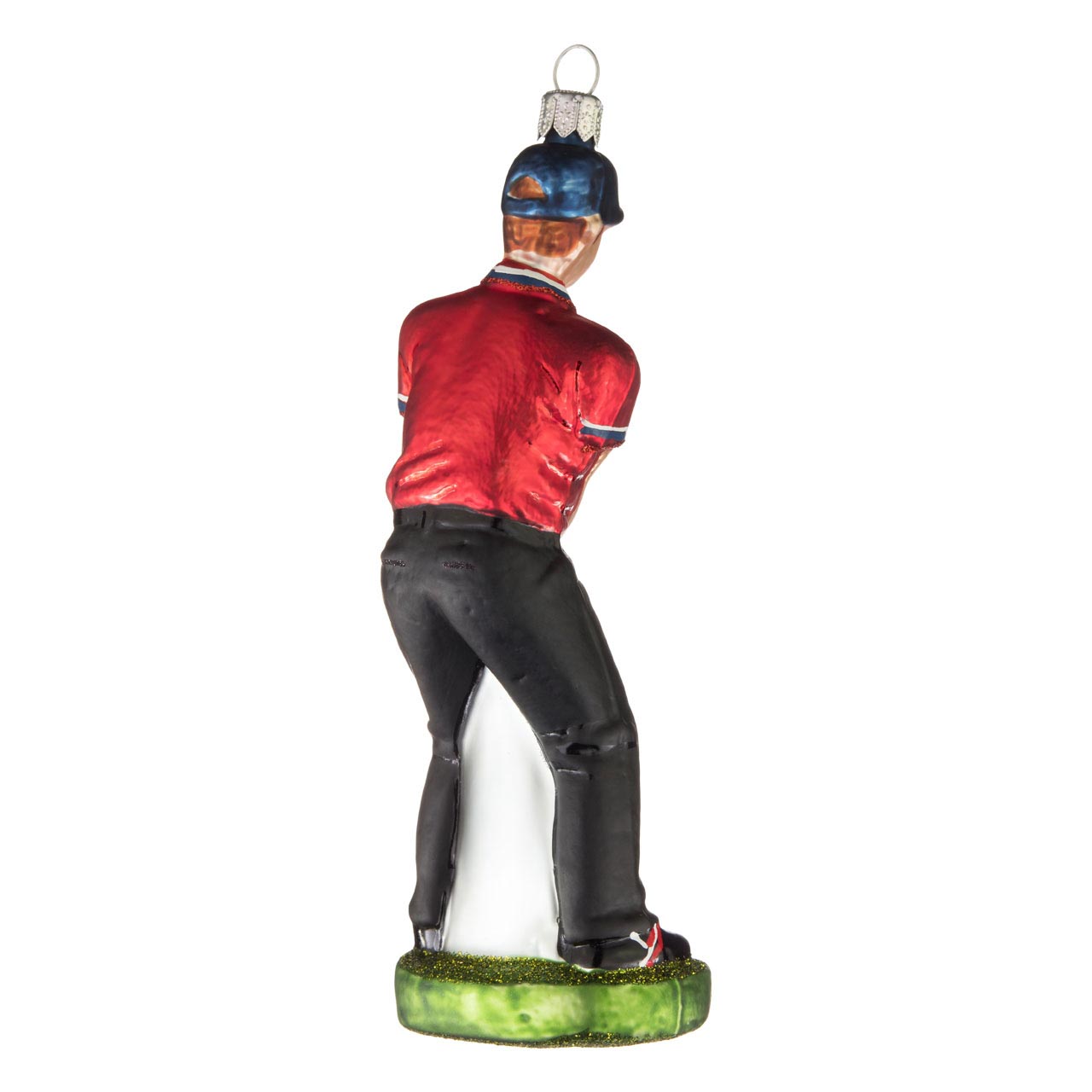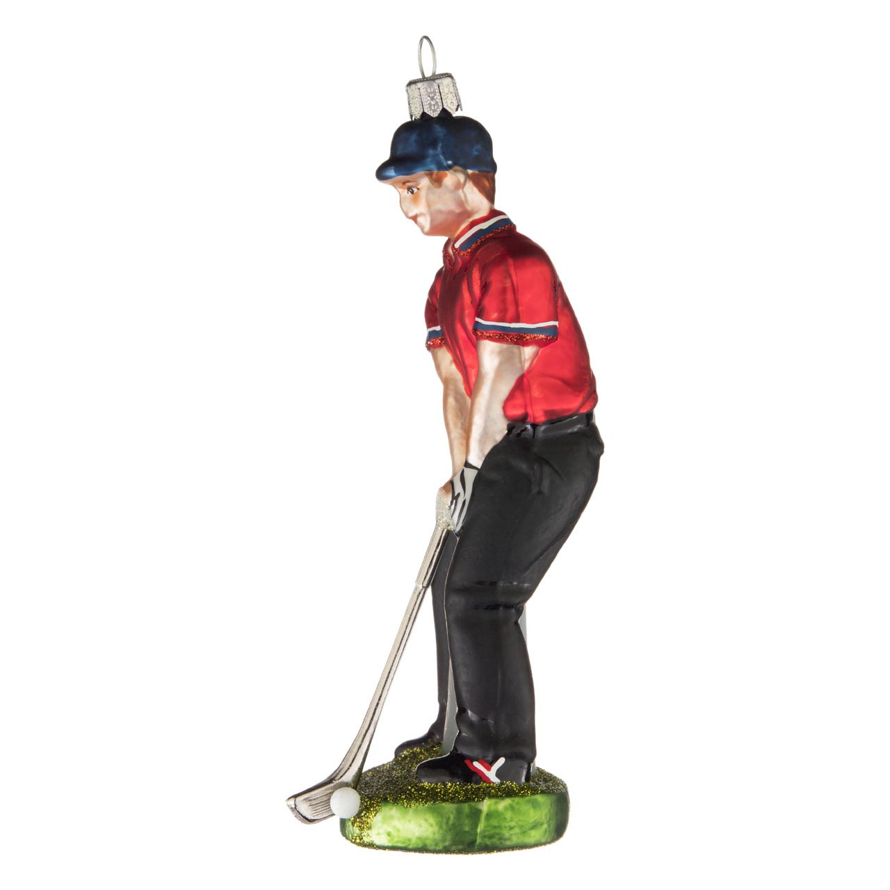 All das ist diese Figur: der Golfer, der in sportlich-konzentrierter Pose seinen silbernen Schläger hält und mit festlich schimmerndem Poloshirt zur matten Hose einfach nur elegant daherkommt. Mit sorgfältigem Pinselstrich wurden Schuhe, Kragen, Ärmelabschlüsse wie Handschuh kunst- und stilvoll verziert. Ein blaues Käppi auf dem Kopf steht in frischem Kostrast zur grasgrünen und stark beglitzerten Bodenplatte. Witziges Detail: Der eben erwähnte Golfschläger wurde ebenso wie ein passender, kleiner, weißer Ball als Kunststoffaccessoire an die Glasfigur angeklebt.