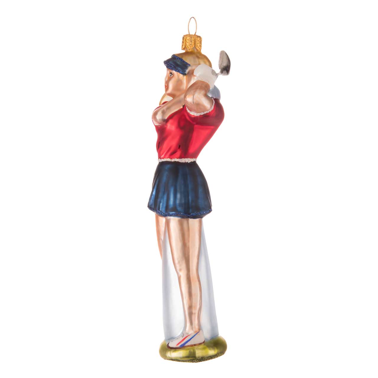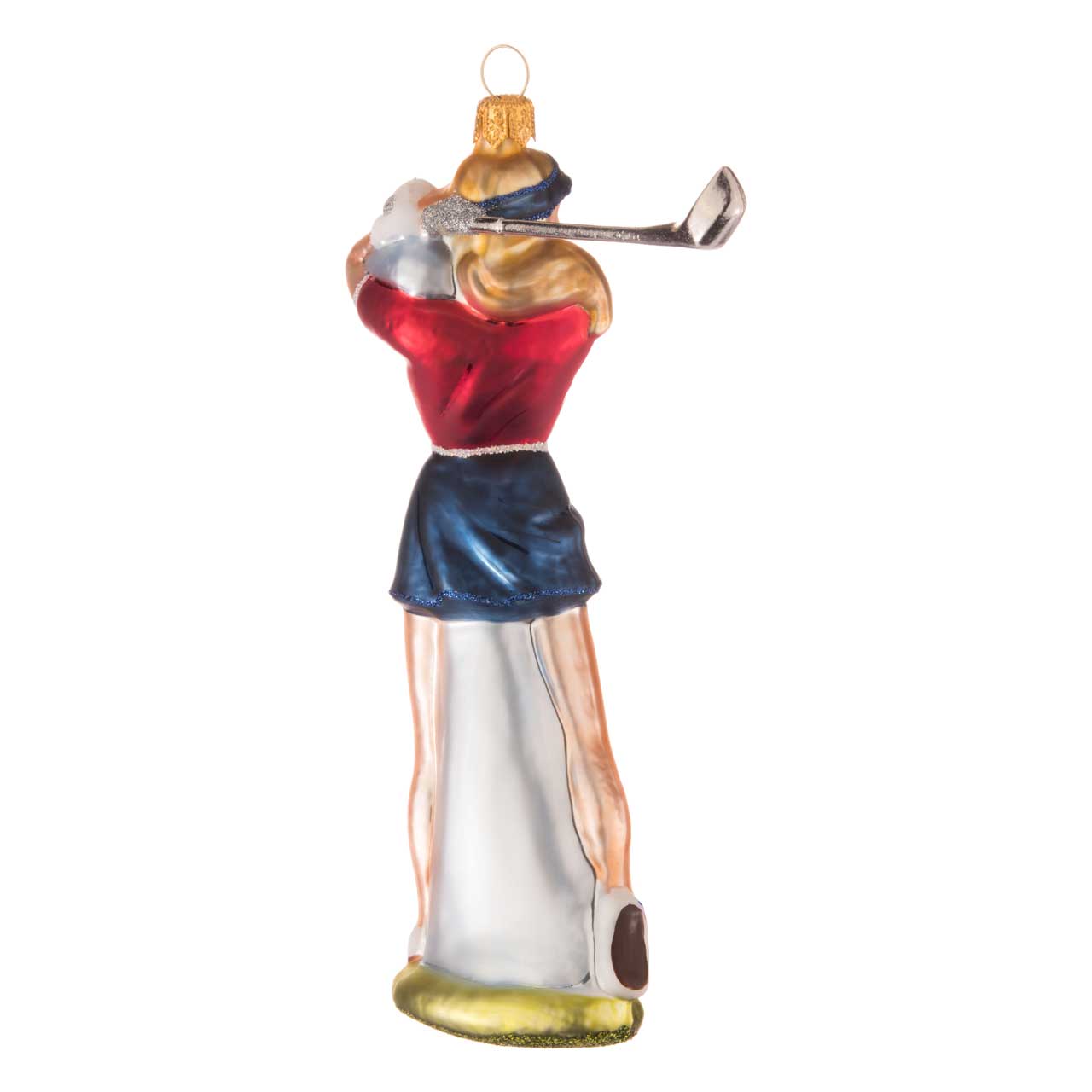 All das ist diese Figur: die Golferin, die in sportlich-konzentrierter Pose ihren silbernen Schläger hält und mit festlich schimmerndem, roten Poloshirt zum dunkelblauen Rock einfach nur elegant daherkommt. Mit sorgfältigem Pinselstrich wurden Schuhe, Paspeln wie Handschuh kunst- und stilvoll lackiert beziehungsweise verziert. Ein blaues Käppi auf dem Kopf steht in frischem Kostrast zur grasgrünen und beglitzerten Bodenplatte. Witziges Detail: Der eben erwähnte Golfschläger, den die sportive Dame gerade durch die Luft schwingt, wurde als Kunststoffaccessoire an die Glasfigur angeklebt.
