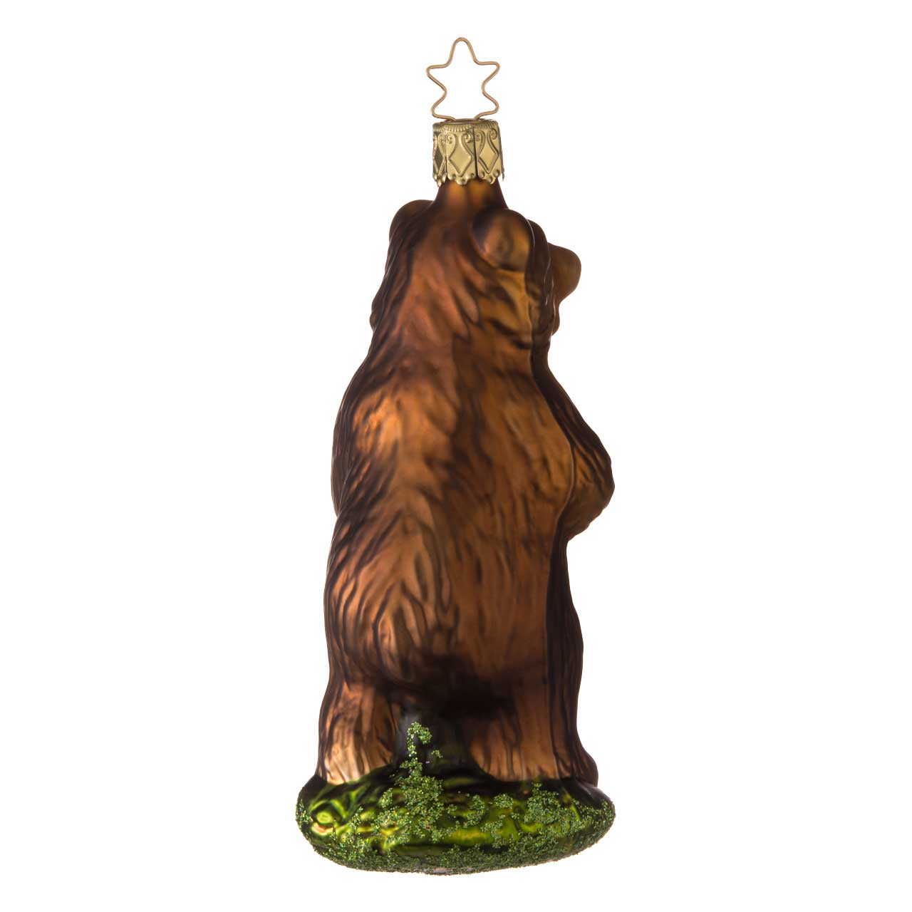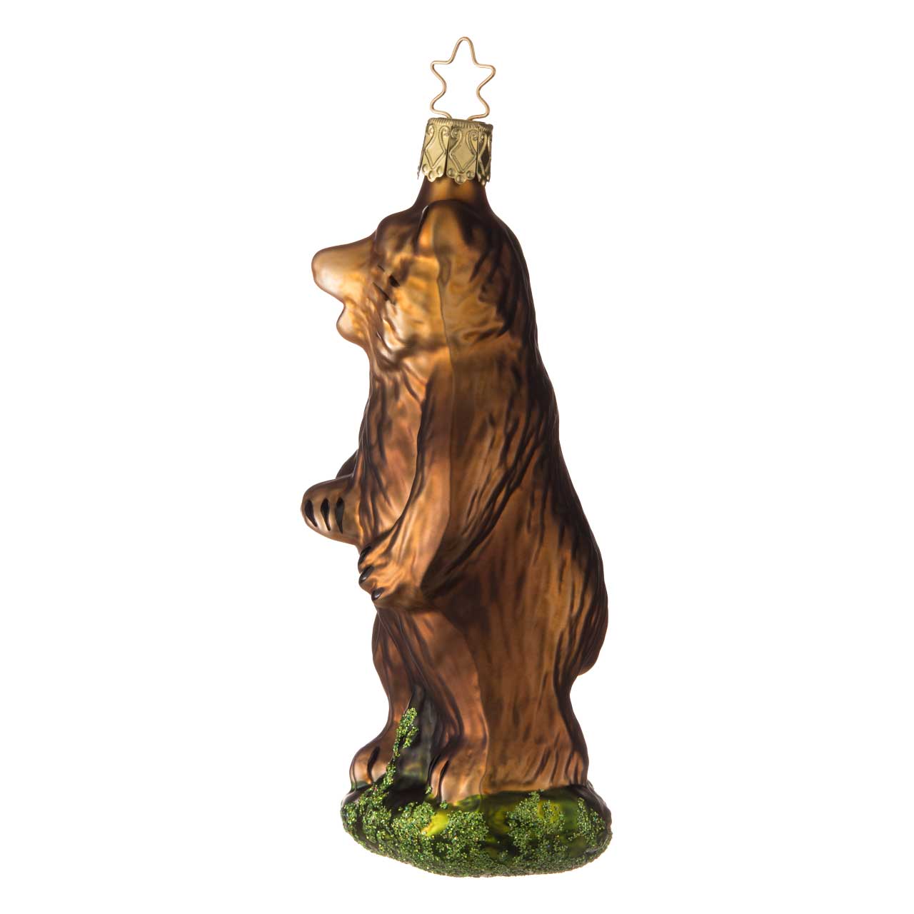 Die Figur zeigt einen aufrecht stehenden Grizzly mit detailreich modelliertem Fell und freundlichem Gesichtsausdruck. Warme Braun- und Goldnuancen dominieren, ergänzt durch dunkle Akzente für die Fellstruktur und ein grün gestalteter Sockel, der an Waldboden erinnert. Die Kugel wirkt dadurch naturverbunden, lebendig und gleichzeitig angenehm rustikal.