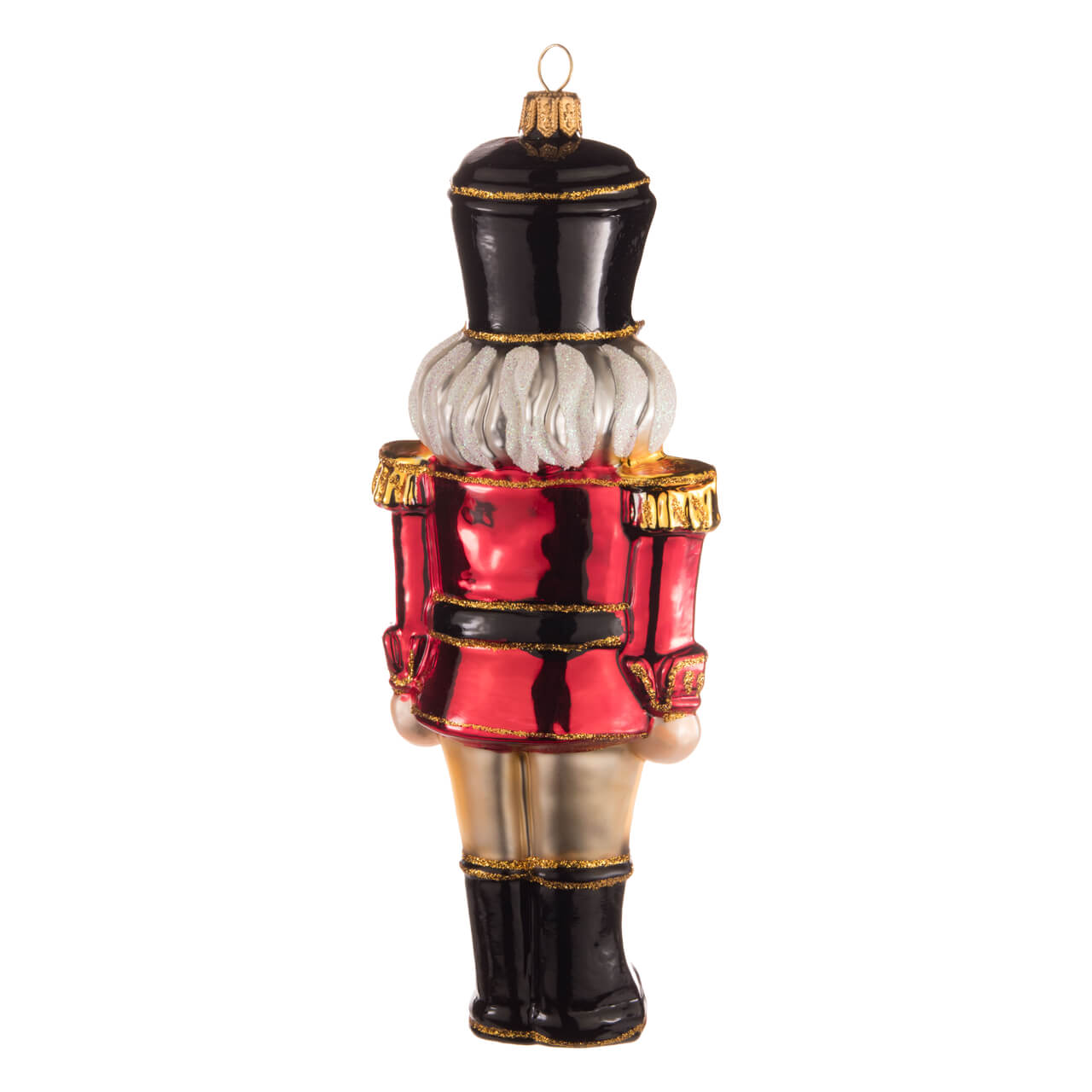 Er ist der Klassiker unter den weihnachtlichen Dekogegenständen: der Nussknacker. Kunstwerk, Küchenhelfer und Holzspielzeug in einer Person und seit Tschaikowskys berühmtem, gleichnamigen Ballett noch so viel mehr. Klar, dass er sich auch als kunstvoll geblasener Glasschmuck im Tannenbaum hervorragend macht. Besonders prachtvoll präsentiert sich dabei dieses stattliche Modell mit einer Größe von 18cm, die ihn auch perfekt als Solitärstück an einem dekorativen Türkranz erstrahlen lässt.