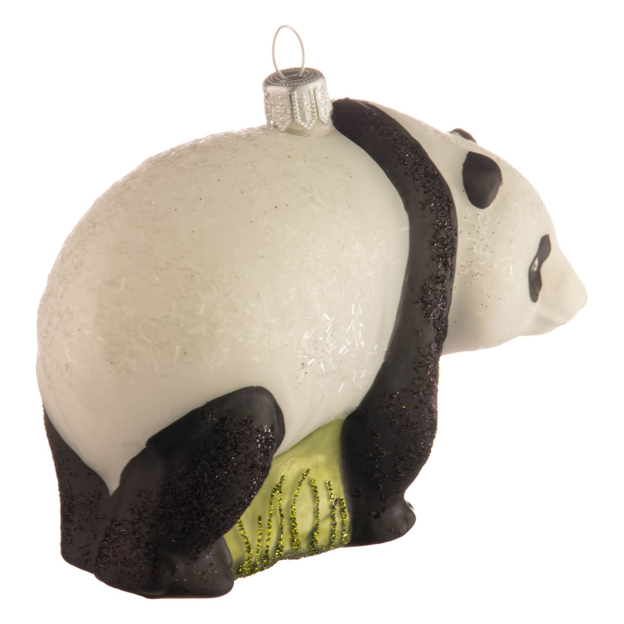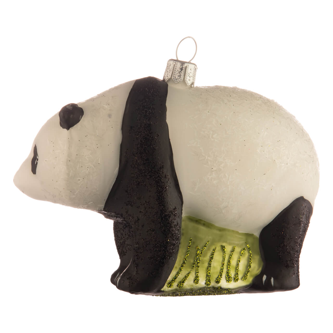 Ist es sein markant geflecktes, schwarz-weißes Fell? Sein dicker Pelz, die behäbige Gestalt oder sind es die schwarz eingefassten, treuen Augen, die uns beim Anblick des großen Pandas regelmäßig dahinschmelzen lassen? Wie ein gemütlicher Teddy kommt der gefährdete und in China beheimatete Bär daher, der auch bei dieser gläsernen Version für den Tannenbaum sämtliche Niedlichkeitsregister zieht; und das, ohne dabei unnatürlich zu wirken.