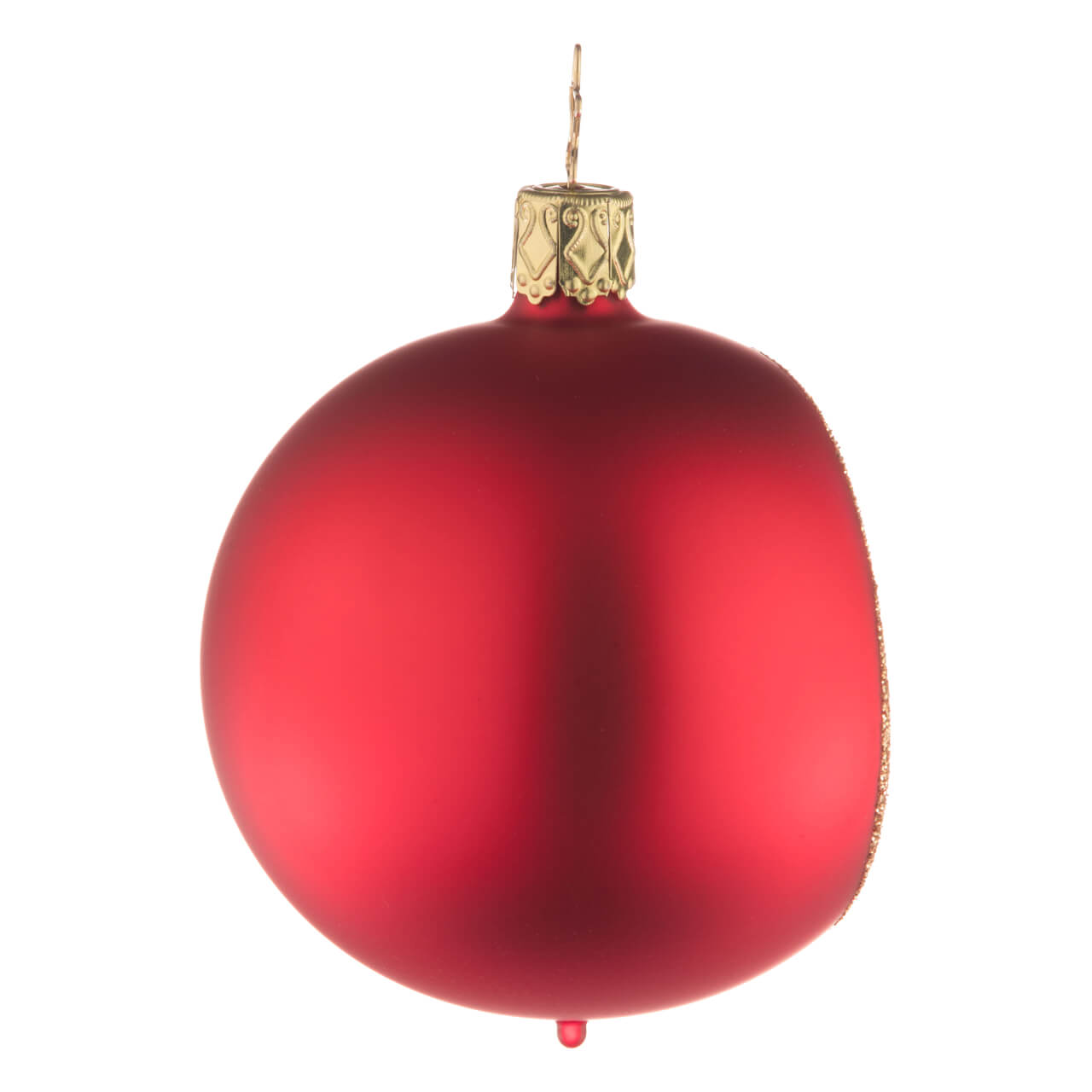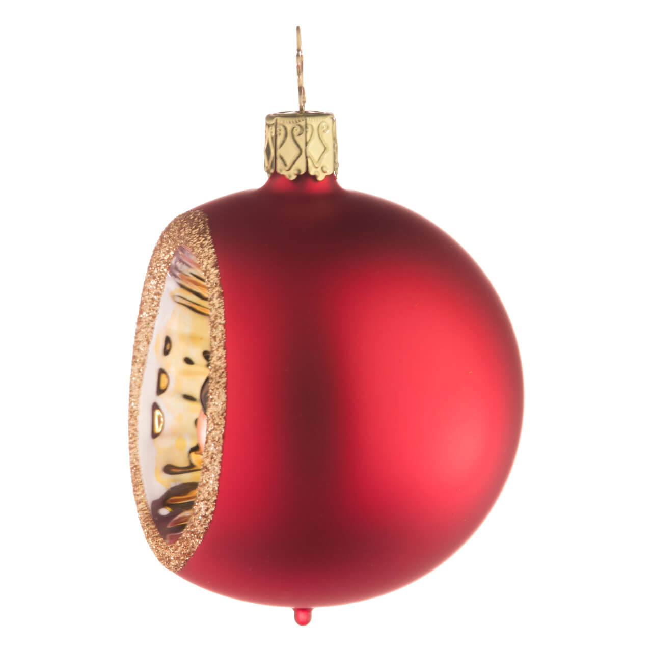 Schon der matte Ton, in dem ihr größter Teil schimmert, entfaltet einen beeindruckende Wirkung. Je nach Version verstrahlt sie tiefe Eleganz (Steinpilzbraun) oder festliche Freude (Festtagsrot). Die runde Öffnung, der Rand der Reflex-Einbuchtung nach innen, wurde außerdem satt und breit mit einem golden glitzernden Saum versehen. Die glänzenden, nach innen führenden Rillen schillern erst gold, in der Mitte dann silbern. Und im Zentrum? Da prangen die Herbstschätze: Zwei Eicheln, matt Champagnerfarben mit glänzenden, dunkelbraunen Kappen, die wiederum in mehrere saftig matt-grüne Eichenblätter münden, deren Adern mit dunkelgrünem Glitterstaub hervorgehoben wurden.