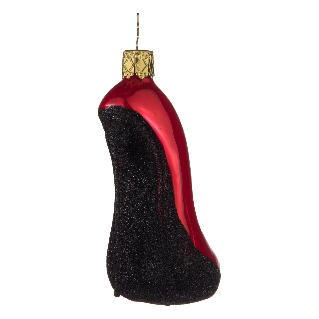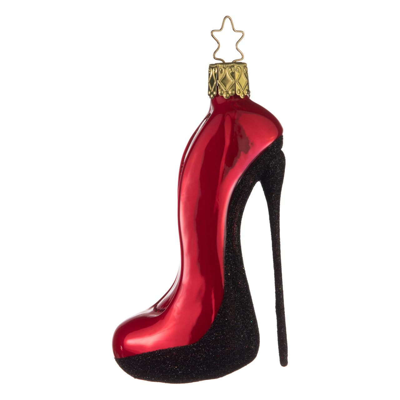 Hoch, höher, am höchsten. Diese Steigerung geht einem wohl durch den Kopf, wenn man den vorliegenden, prachtvollen Schuh im Weihnachtsbaum entdeckt. Ob man auf so einem hohen Absatz überhaupt gehen kann? Egal! Das kunstvolle Stück ist schließlich nicht für den Asphalt gemacht, sondern für den Tannenbaum.