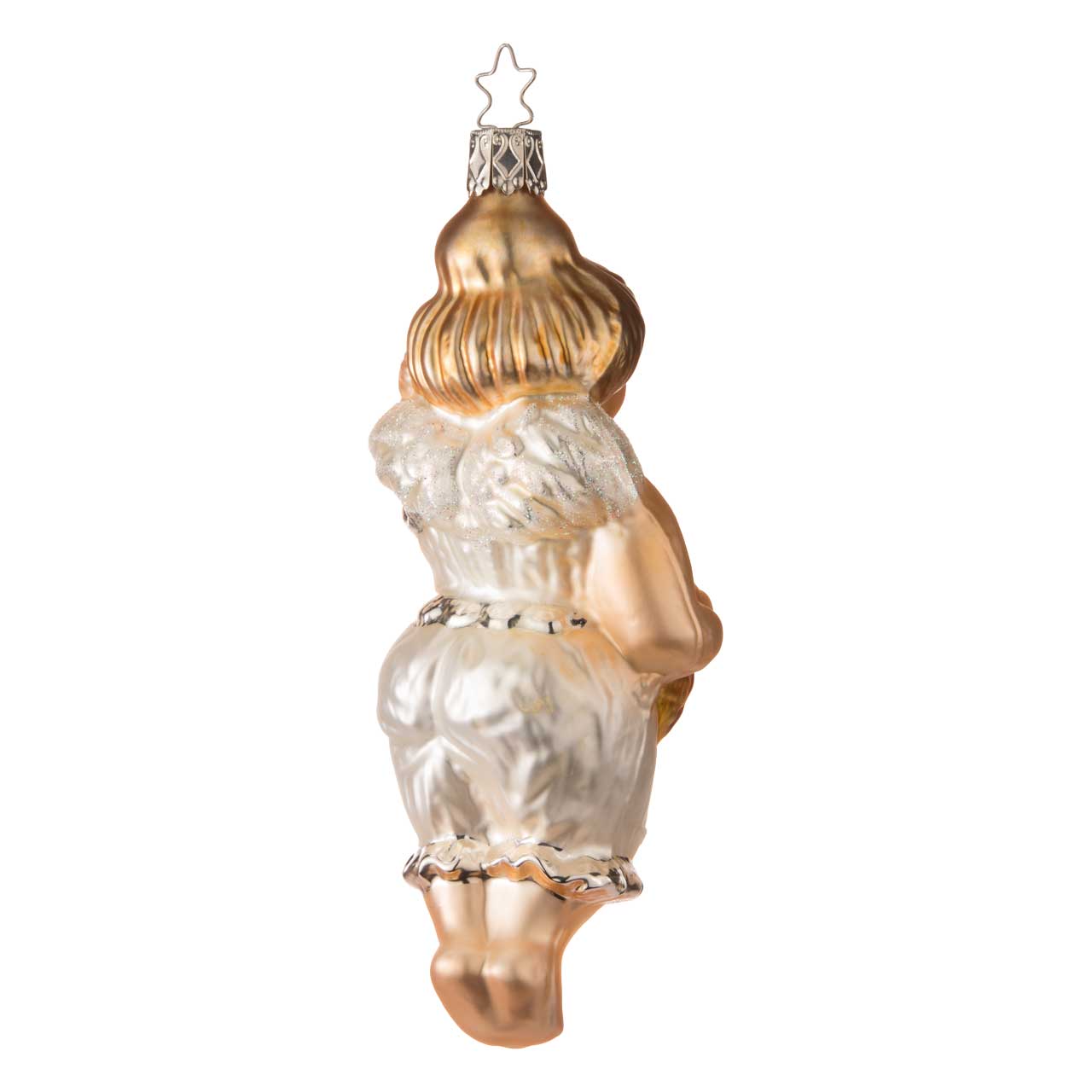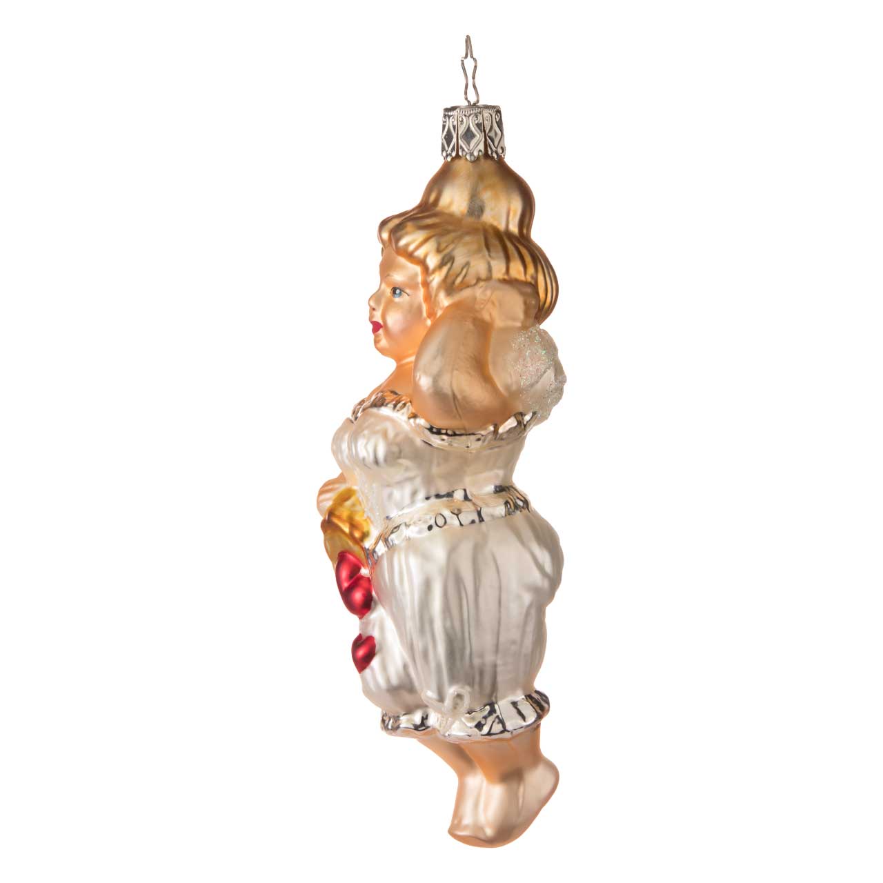 Die Figur ist länglich geformt und zeigt eine stilisierte, weibliche Gestalt in sanfter Pose. Farblich dominieren warme Hauttöne, ein cremeweißes Outfit sowie goldene Akzente in Haar und Details. Kleine rote Herzen setzen lebendige Kontraste und verleihen der Kugel einen charmanten, romantischen Look.