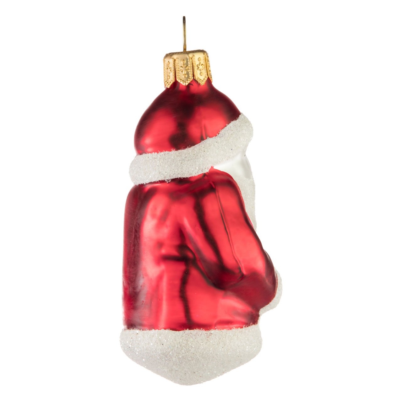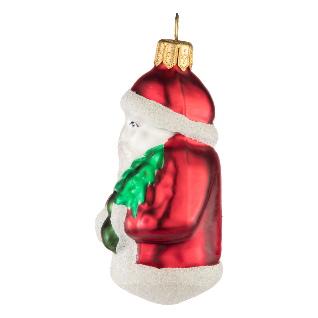 Wie ein kleiner Zapfen, leicht kegelförmig und stilisiert, so baumelt der historische Weihnachtsmann von seinem goldenen Krönchen herab. Die typische Mütze mit der breiten, weiß glitzernden Pelzkrempe auf dem ehrwürdigen Haupt; das passende Mäntelchen darunter, das in einer stumpfen, schneeweiß beglitzerten Spitze endet. In einem matten Rotton trägt der Geschenkebringer seine wärmende Winterbekleidung; festlich wie vornehm. Dunkelgrüne Fausthandschuhe bilden einen gelungenen Kontrast. Was sie vor dem Bauch umklammern? Ein frischgrünes, kleines Tannenbäumchen, das ebenso zum Träumen einlädt wie der Blick aus den filigran aufgemalten, blauen Augen im silberweißen Gesicht des Weihnachtsmanns.