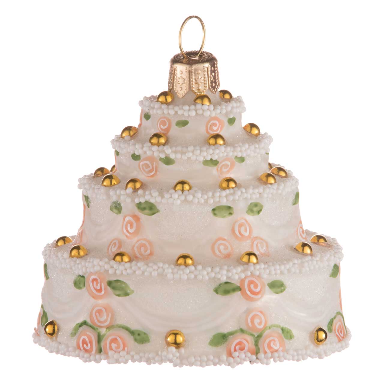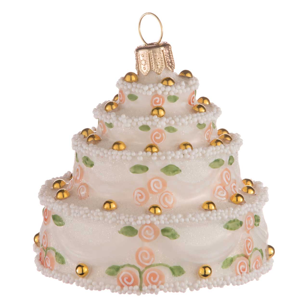 In vier Etagen schichtet sich das Backwerk zylindrisch verjüngend von unten nach oben. Wie mit weißem Fondant überzogen schimmert die Oberfläche dabei in mattem Weiß. Feine, ebenfalls weiße Kügelchen garnieren alle Kanten und Etagen, als wären sie mit hellen Liebesperlen verziert. Größere, golden glänzende Kugeln auf den Oberseiten sorgen für einen festlichen Wow-Effekt. Absolutes Highlight ist jedoch die filigrane Rosenbemalung mit rosa-weißen Blüten und hellgrünen Blätterranken, die jede Etage liebevoll verzieren.