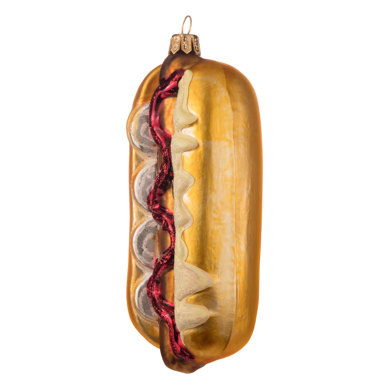 Halb aufgeschnitten dient das klassische, goldgelbe Hotdog-Brötchen als Träger für eine eine Wurst und die bekannten Zutaten: