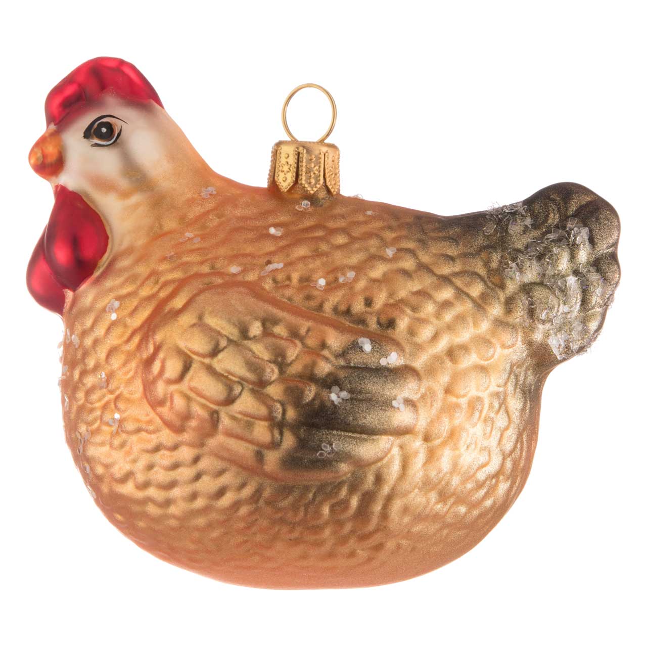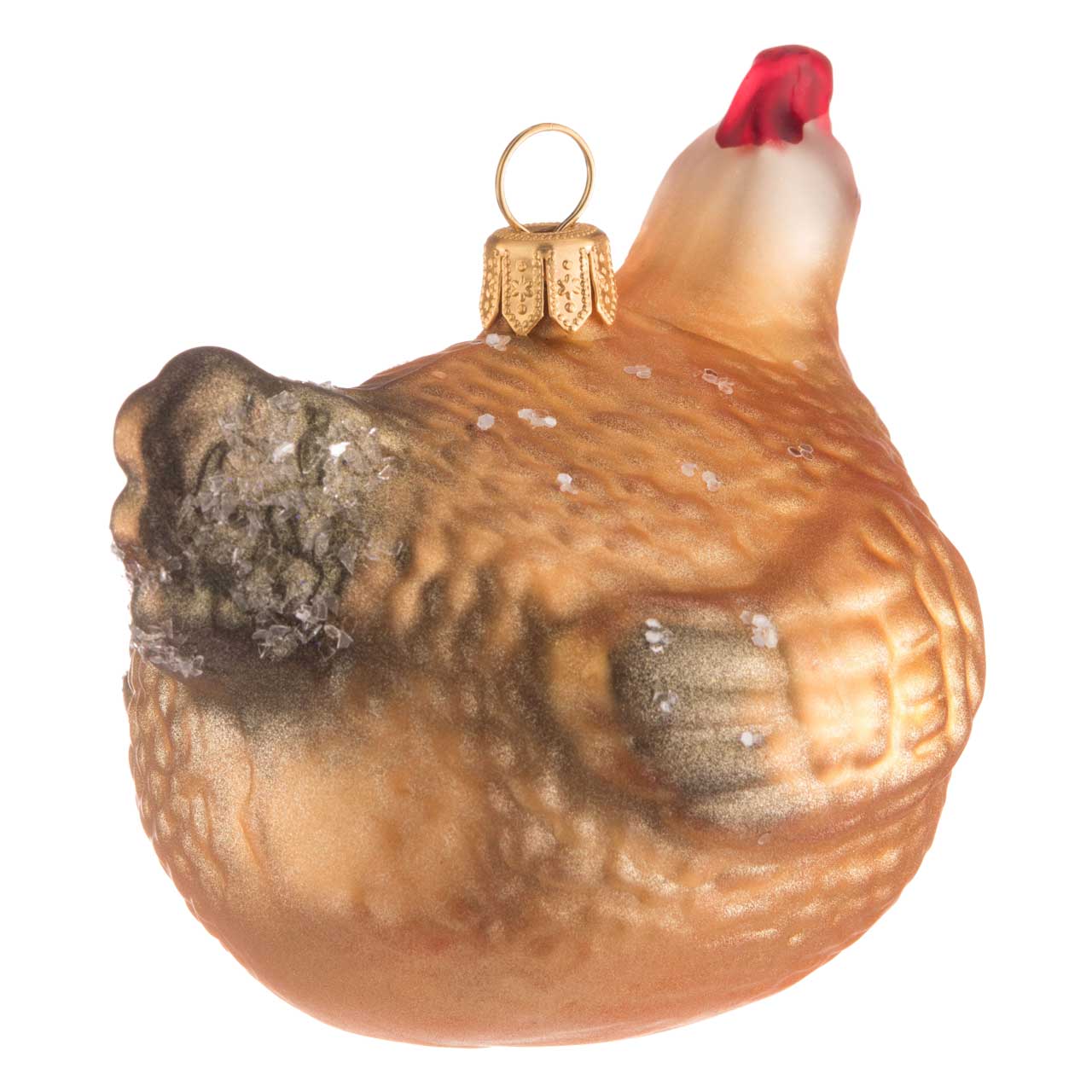 Fast eine Kugel, oder nicht? Das Hühnchen macht seinem Auftritt als Christbaumkugel am Weihnachtsbaum wirklich alle Ehre. Dick aufgeplustert baumelt es von seinem goldenen Krönchen herab. Goldbraun schimmert sein helles Gefieder. Flügel und Schwanz weisen dunkle Spitzen in elegantem Farbverlauf auf.